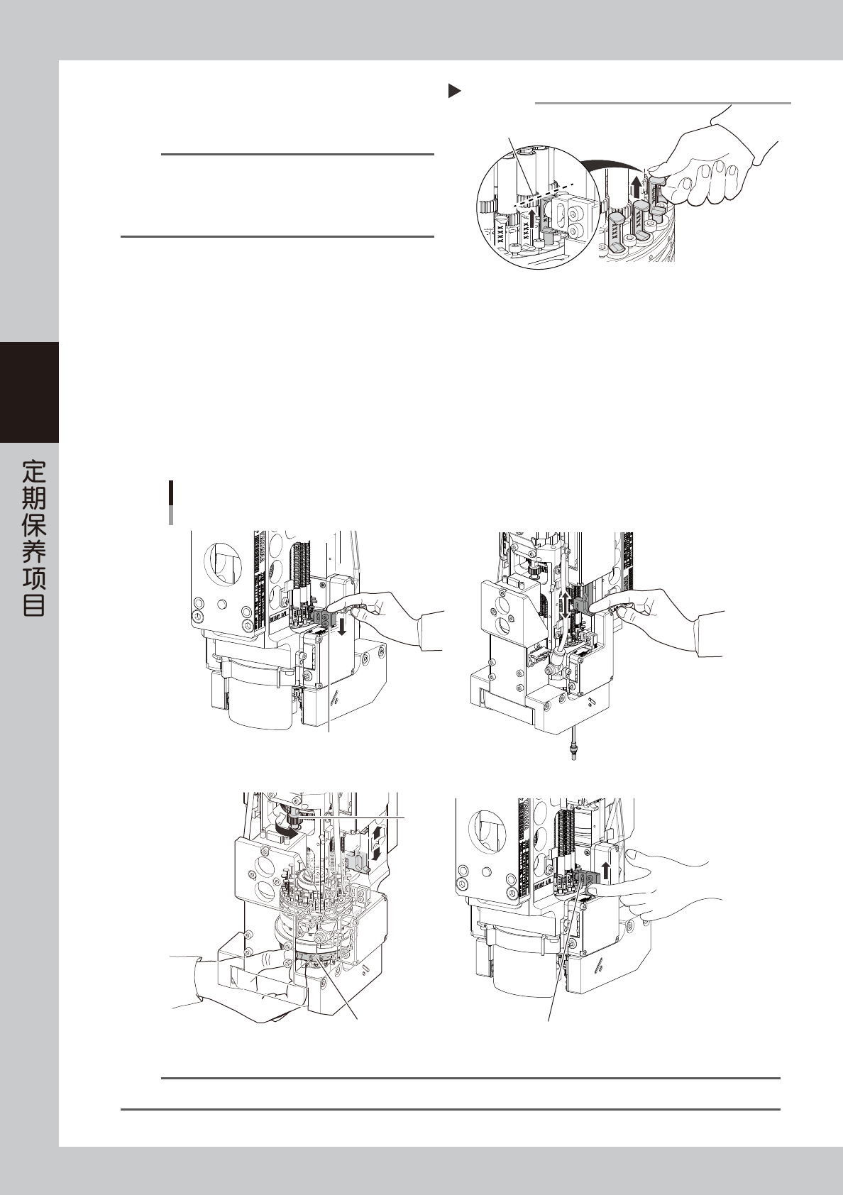 3-80 3 7 将所有机械阀装入“吸气位置” 。 用手将对象贴装头单元的所有机械阀上提到上升端 ( 吸气位置 )。 参考 机械阀的上升端在用手指可以轻松上提到的位置。大约将机 械阀上提到吸嘴轴齿轮 ( 上侧齿轮 ) 的中央高度。机械阀的上 下行程只有约 3mm。过度上提,机械阀会脱落。上提时请注 意不要使其脱落。 8 对吸嘴轴内进行排气。 1. 用手使对象压杆侧的 V 轴下降,对象机械阀会随之下降,吸嘴轴内将会被排气。 2. 用手指使…
