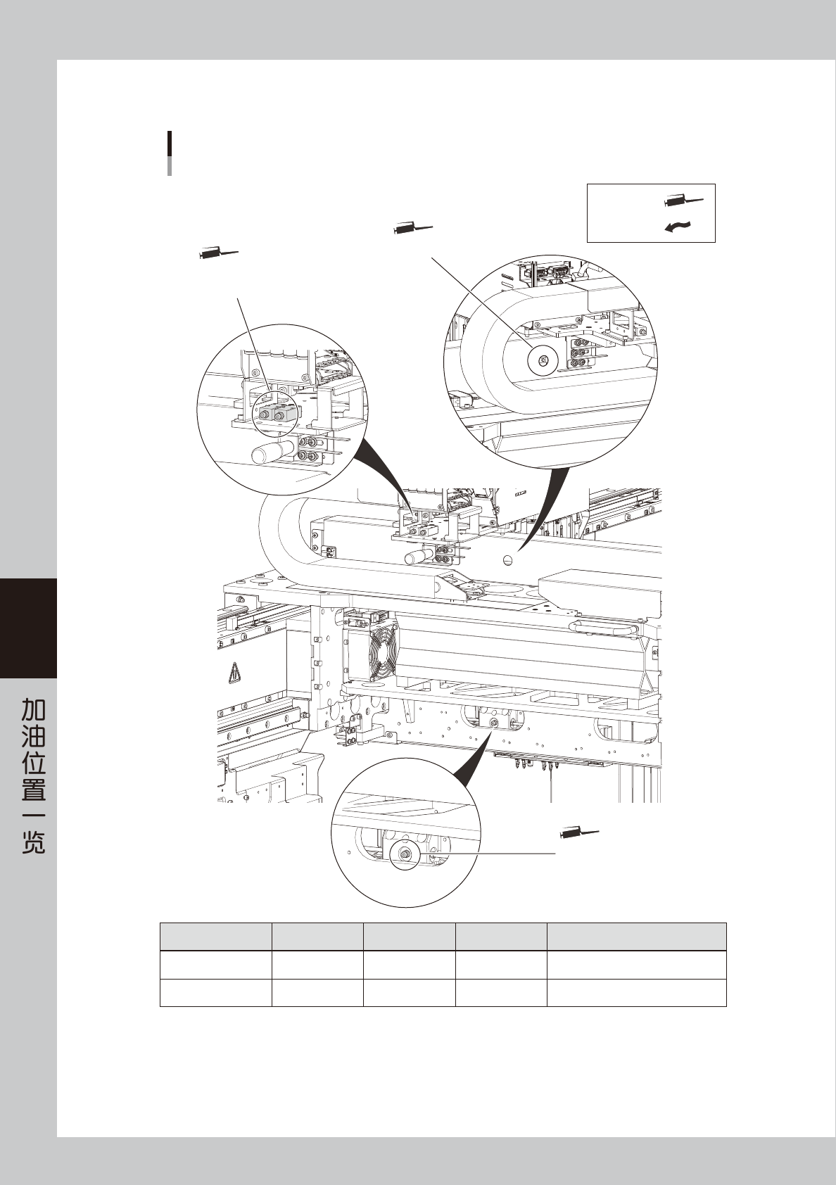 5-3 5  2. 加油位置与加油频率 ( 贴片机主体 ) 2.1 X 轴 2.1.1 4 梁机型 X轴的加油位置 (4梁机型) 滚珠丝杆、导轨 润滑油枪 : 用手涂抹 : X轴滚珠丝杆部 X轴导轨部 上侧润滑油注油嘴 X轴导轨部 下侧润滑油注油嘴 X轴导轨部 上侧润滑油注油嘴 X轴导轨部 下侧润滑油注油嘴 加油部位 润滑油种类 加油位置 频率 加油方法 滚珠丝杆 NSL 1 ( 各工作台 ) 1次/月 润滑油枪 : 弯折型枪嘴 (…