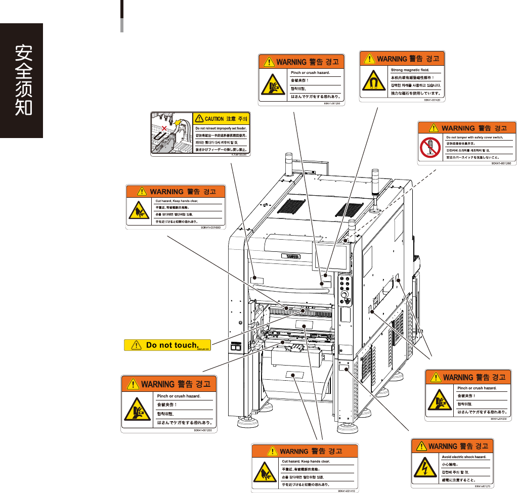 为了安全使用设备,如下图所示,在设备各个部位张贴了警告标贴,务必严格遵守标贴指示。此外,关于本节所