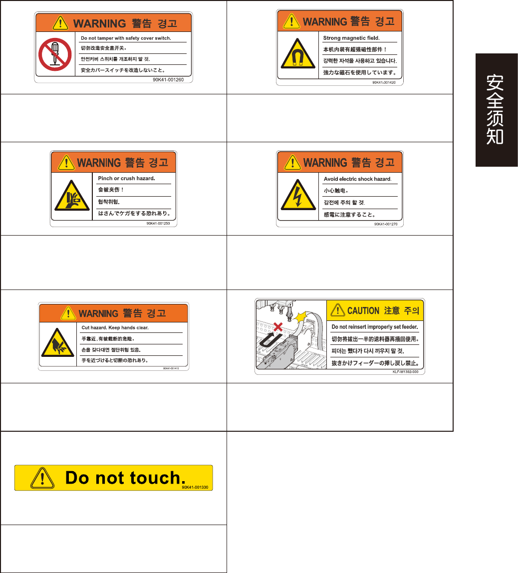 vi ■ 标贴张贴位置 警告标贴 背面 ■ 开闭机盖 (前后) ■ 开闭机盖 (前后) ■ 送料器安装部 (前后) ■ 切带机部 ■ 切带机部 ■ 传送轨开口部 (前后、左右) ■ 开闭机盖内部 (前后) ■ 盖板内部 ■ 切带机斜板部 95201-N9-00
