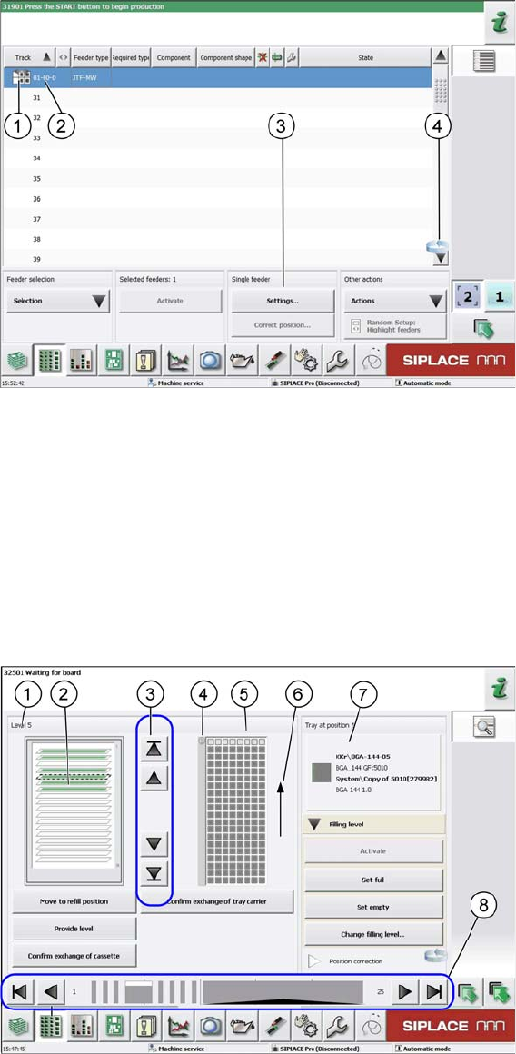 Tasks on the Machine Operating the JEDEC Tray Feeder in the Station Software (SW708) 48 User Manual JTF-MW on SIPLACE E Track information view 1. SIPLACE JTF-MW 2. Abbreviation for the SIPLACE JT F feeder ( visualization…