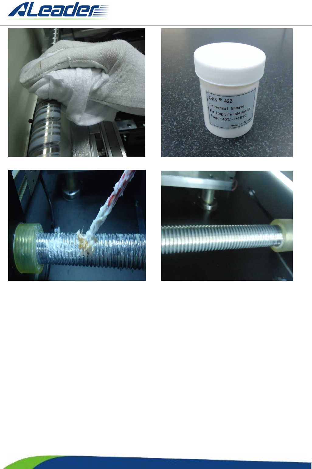 地址: 东莞市东 城区牛山 金鸡岭兴 华工 业园 F 栋 电话: +8 6-400-1 189-123 E-m ail: aoi@aleade r .hk Http:// www.aleader.hk TEL:+86 - 400 - 1189 - 123 E - mail:aoi@aleader.hk Page: 143 of 199 图 3-18 清除陈油 图 2-19 OKS422 油脂(机器附件) 图 3-20 丝杠加入新油 图 …