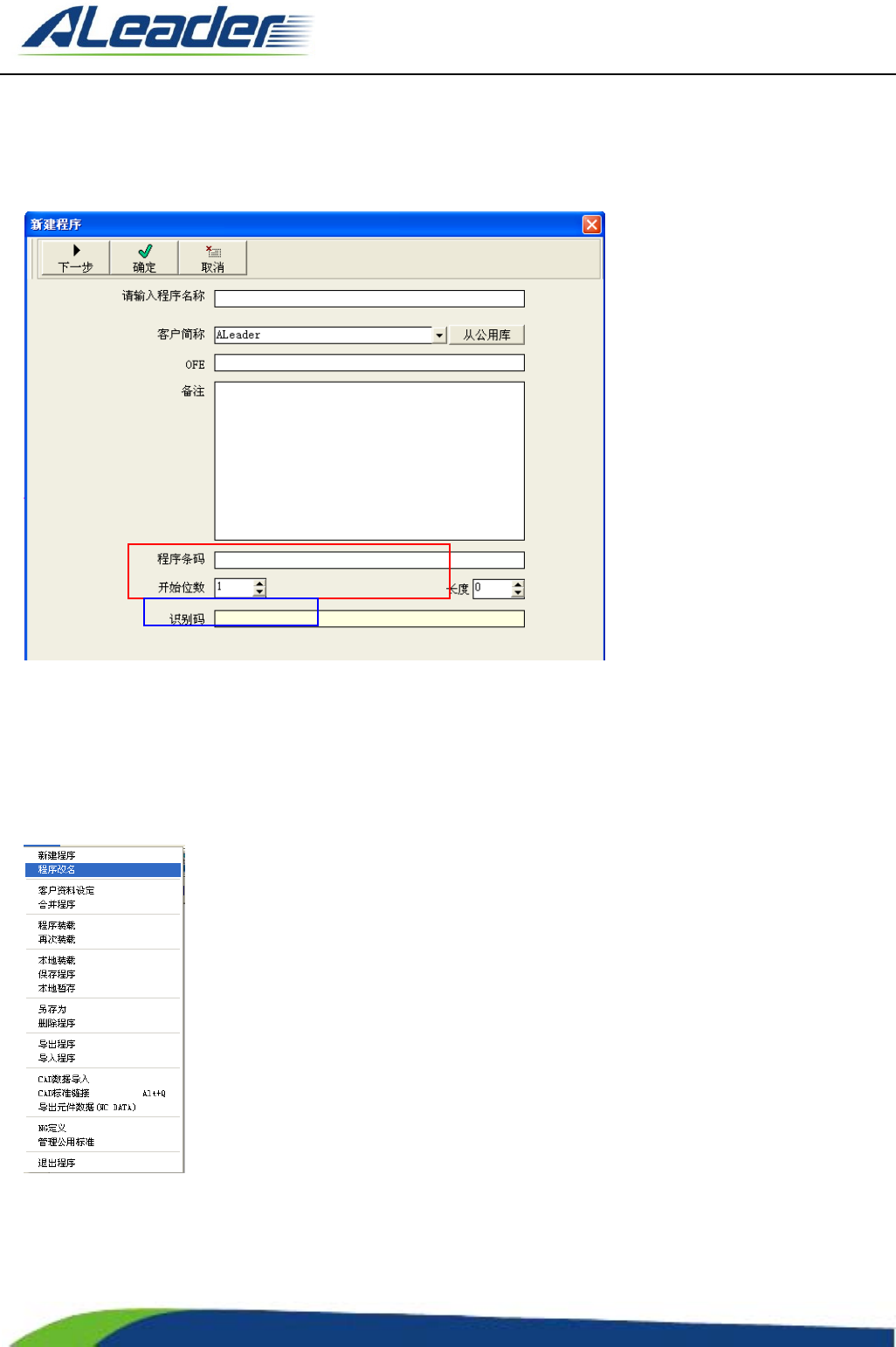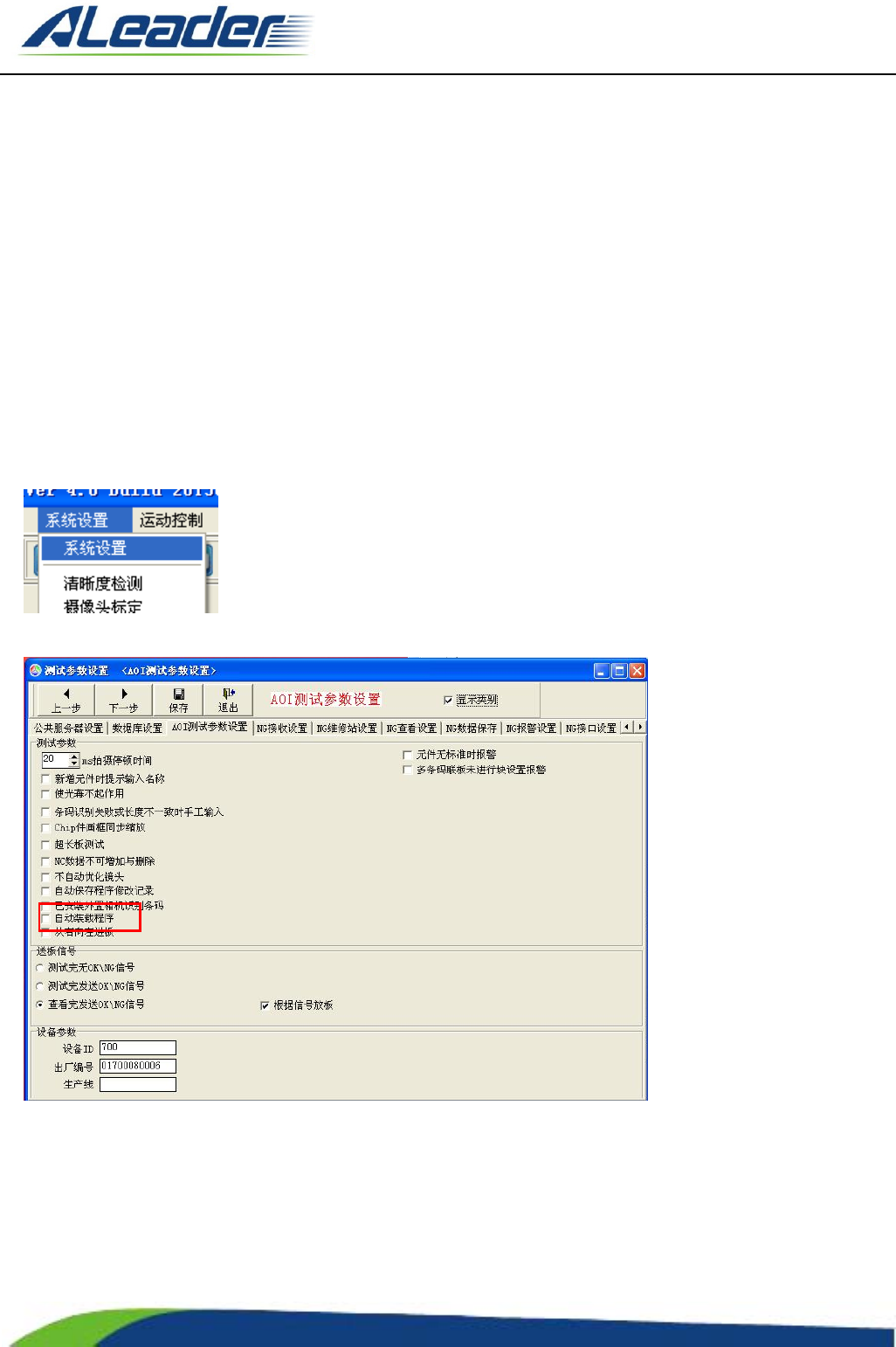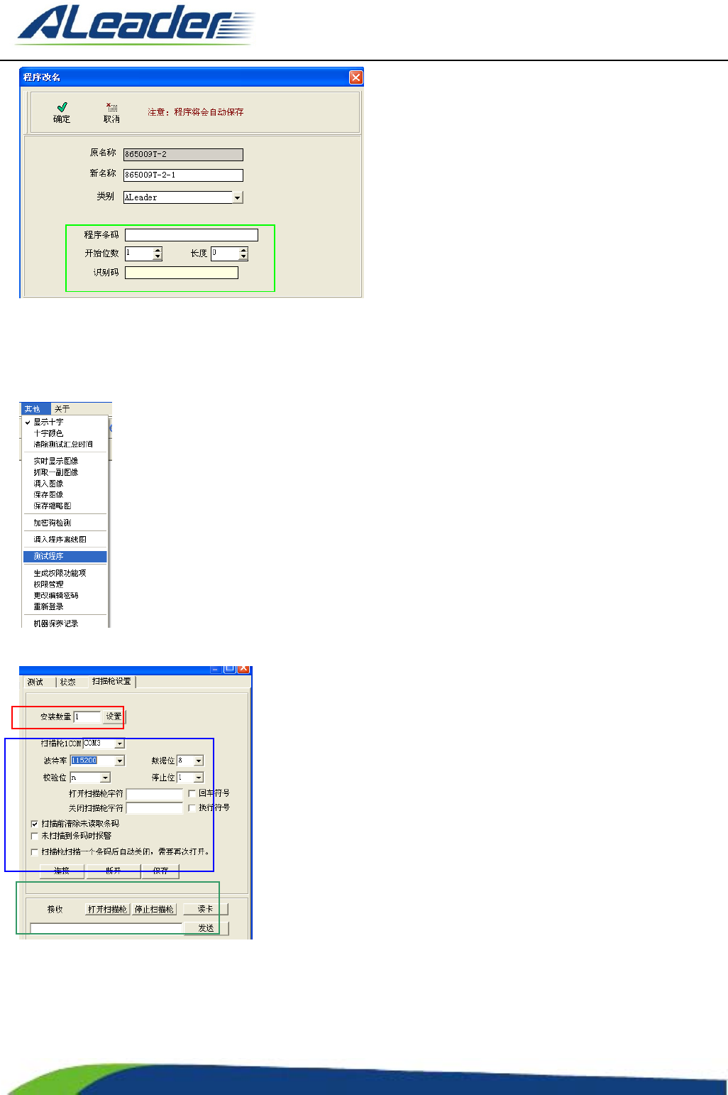 地址: 东莞市东 城区牛山 金鸡岭兴 华工 业园 F 栋 电话: +8 6-400-1 189-123 E-m ail: aoi@aleade r .hk Http:// www.aleader.hk TEL:+86 - 400 - 1189 - 123 E - mail:aoi@aleader.hk Page: 193 of 199 在上图绿色区域内, 按照 新建程序 中的 1,2,3 步骤操 作,此时即程序部分 满足要求。 设置条码…