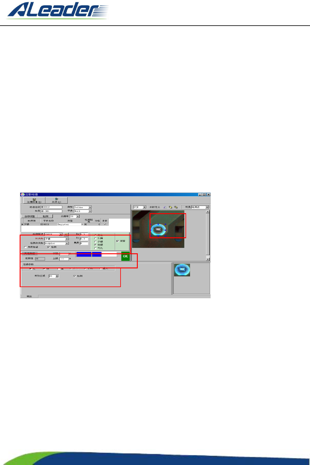 地址: 东莞市东 城区牛山 金鸡岭兴 华工 业园 F 栋 电话: +8 6-400-1 189-123 E-m ail: aoi@aleade r .hk Http:// www.aleader.hk TEL:+86 - 400 - 1189 - 123 E - mail:aoi@aleader.hk Page: 33 of 199 上图为 DI P 件的“少 锡”注册窗体图, 说明如下: ① ROI 区域:整个焊 盘区域。 ② 检测算…