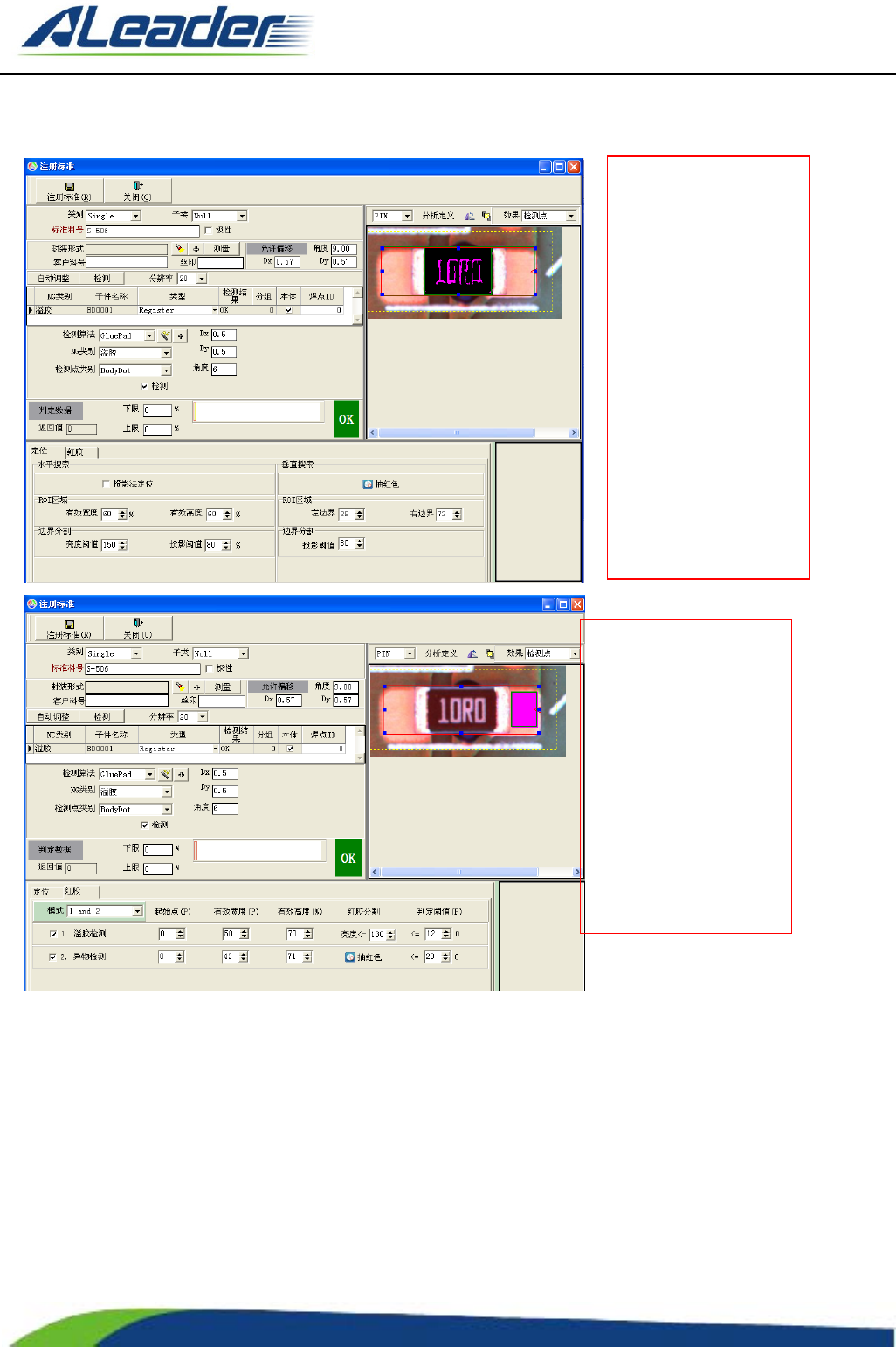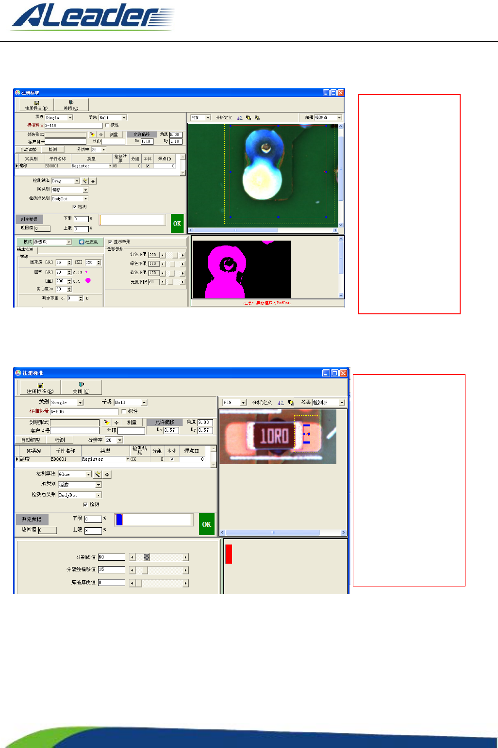 地址: 东莞市东 城区牛山 金鸡岭兴 华工 业园 F 栋 电话: +8 6-400-1 189-123 E-m ail: aoi@aleade r .hk Http:// www.aleader.hk TEL:+86 - 400 - 1189 - 123 E - mail:aoi@aleader.hk Page: 45 of 199 3.2.8 D re g 算法 3.2.9 Glue 算法 左 图 为 ”Dreg ” 算 法 的检测示…