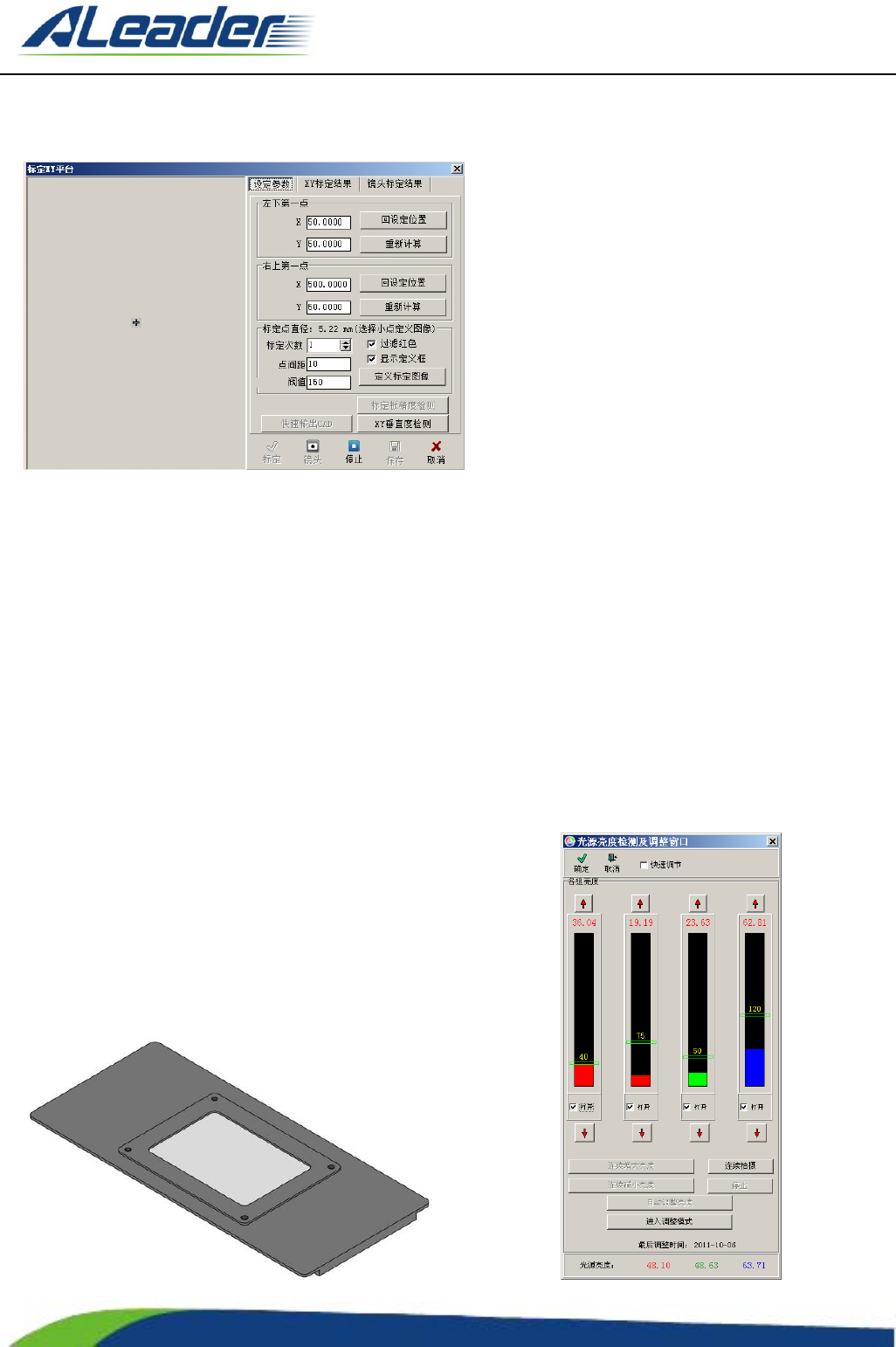 地址: 东莞市东 城区牛山 金鸡岭兴 华工 业园 F 栋 电话: +8 6-400-1 189-123 E-m ail: aoi@aleade r .hk Http:// www.aleader.hk TEL:+86 - 400 - 1189 - 123 E - mail:aoi@aleader.hk Page: 64 of 199 标准色卡 光源亮度检测 作用 : 检测与 调整光源亮度 调整方法 : 1) 固定好标准色卡 (随机附件)…