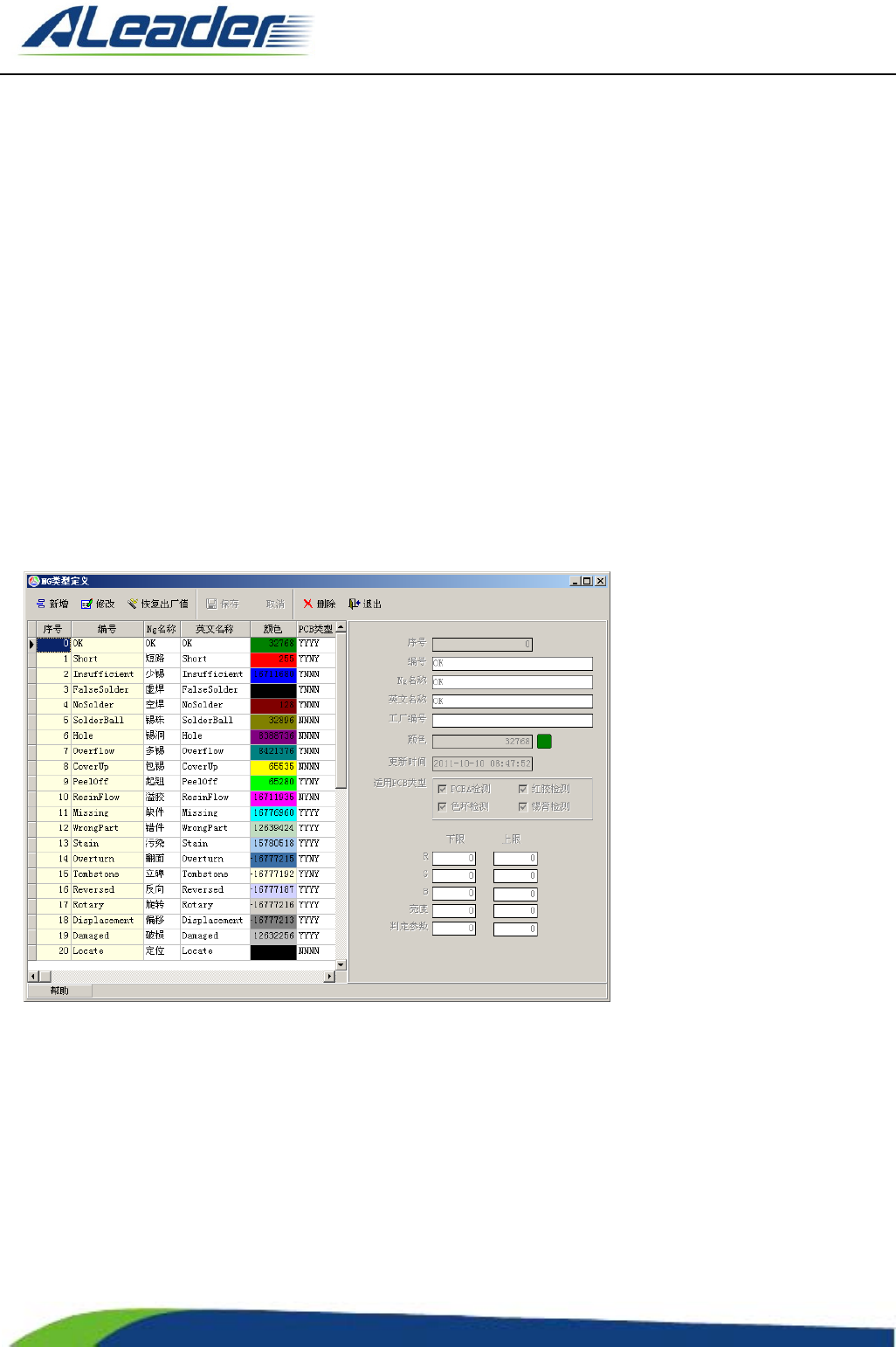 2. 修改: 可对当前行的 NG 类型及检测项默认参数在窗口右边进行修改, 修改完毕后要保存才生效;
