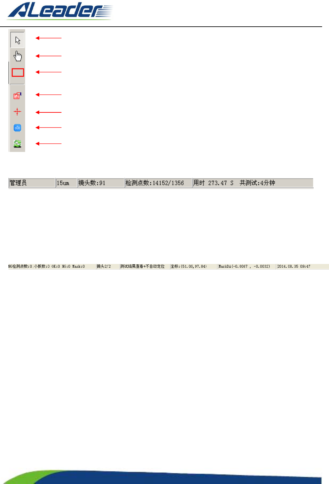 地址: 东莞市东 城区牛山 金鸡岭兴 华工 业园 F 栋 电话: +8 6-400-1 189-123 E-m ail: aoi@aleade r .hk Http:// www.aleader.hk TEL:+86 - 400 - 1189 - 123 E - mail:aoi@aleader.hk Page: 75 of 199 4. 状态栏 (1) 管理员 : 指当 前登录的 用户身份 ; (2) 15um : 当前 FOV 显示…