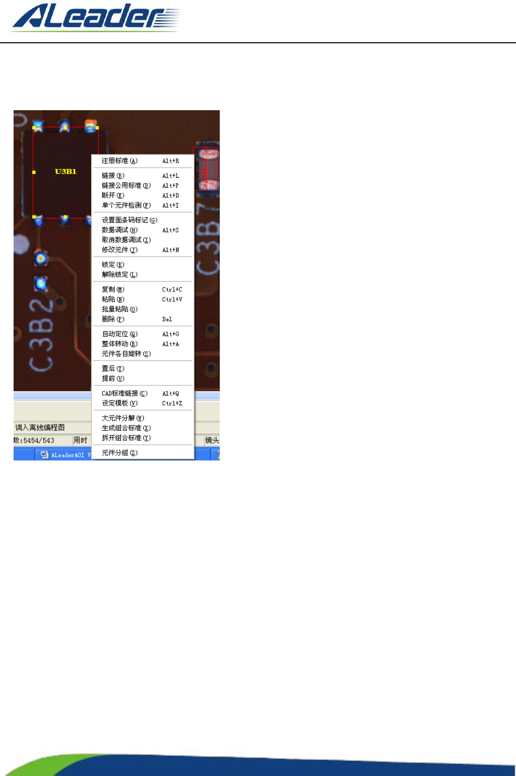 地址: 东莞市东 城区牛山 金鸡岭兴 华工 业园 F 栋 电话: +8 6-400-1 189-123 E-m ail: aoi@aleade r .hk Http:// www.aleader.hk TEL:+86 - 400 - 1189 - 123 E - mail:aoi@aleader.hk Page: 102 of 199 3.6.2.9 元 件 框右键 菜 单下功能 (1) 注册标准 新注册一个元件标准 。可以使用快捷键 …