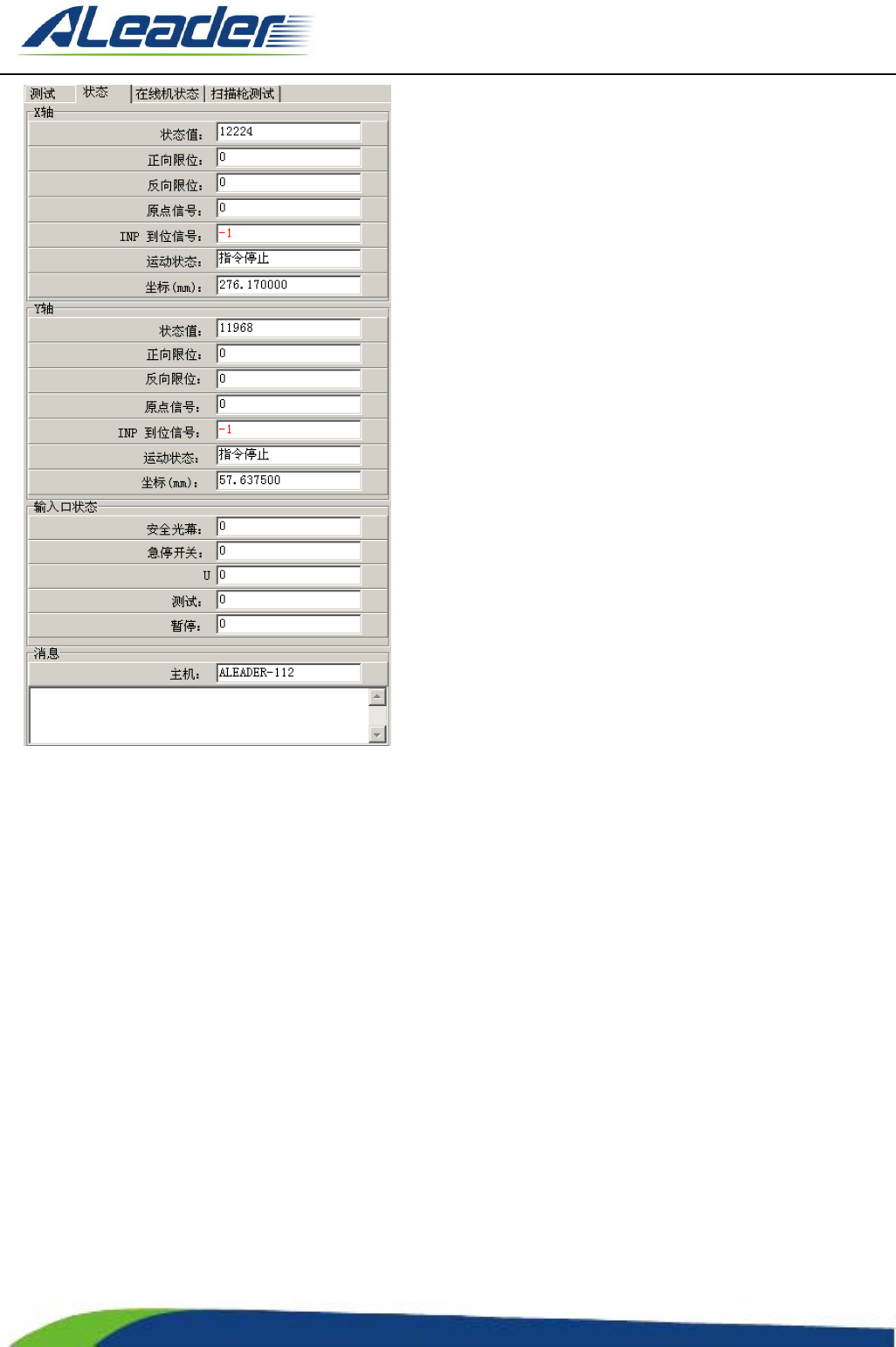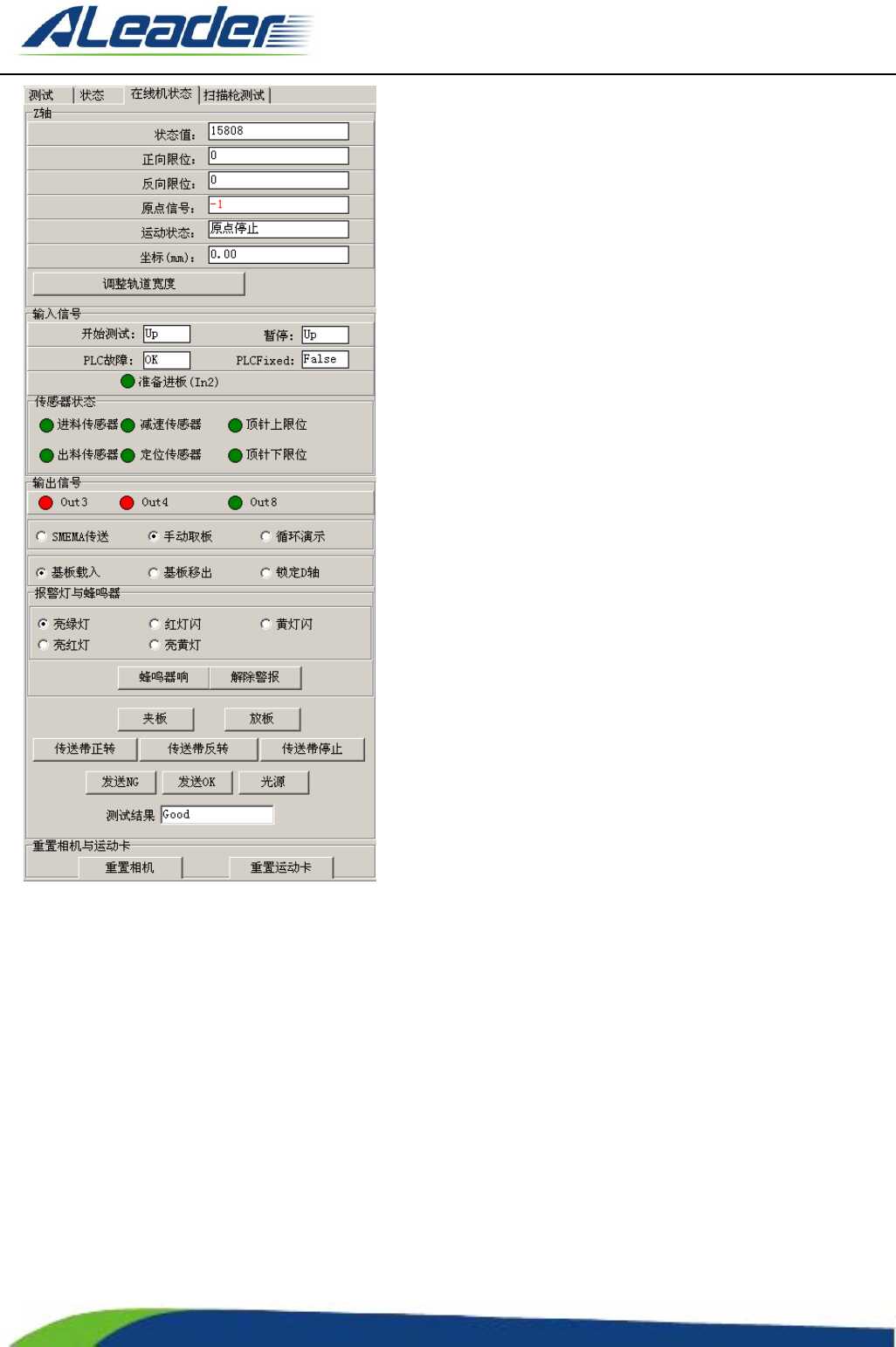 地址: 东莞市东 城区牛山 金鸡岭兴 华工 业园 F 栋 电话: +8 6-400-1 189-123 E-m ail: aoi@aleade r .hk Http:// www.aleader.hk TEL:+86 - 400 - 1189 - 123 E - mail:aoi@aleader.hk Page: 171 of 199 输入信号 开始测试,暂停:标 识机器上这 2 个按钮的状态 ,被按下时显示 Down ,弹起时是 Up…