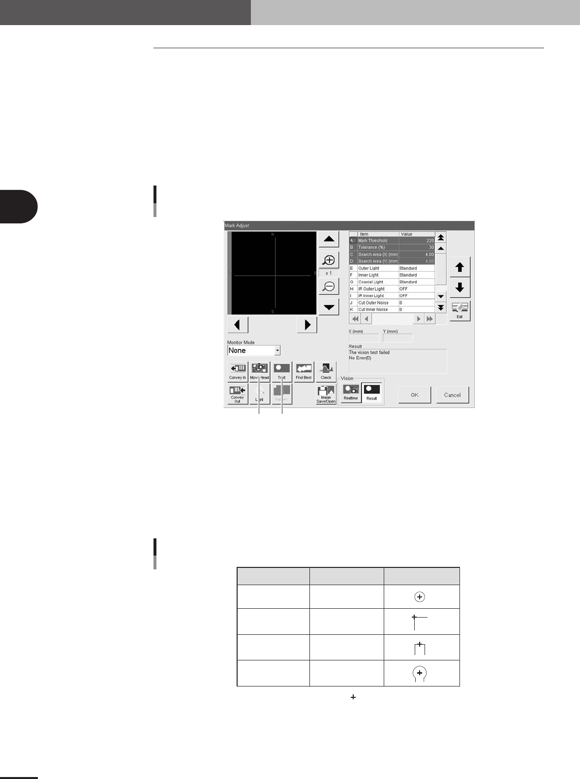 aligned with the cross cursor on the vision monitor as shown in the table below.