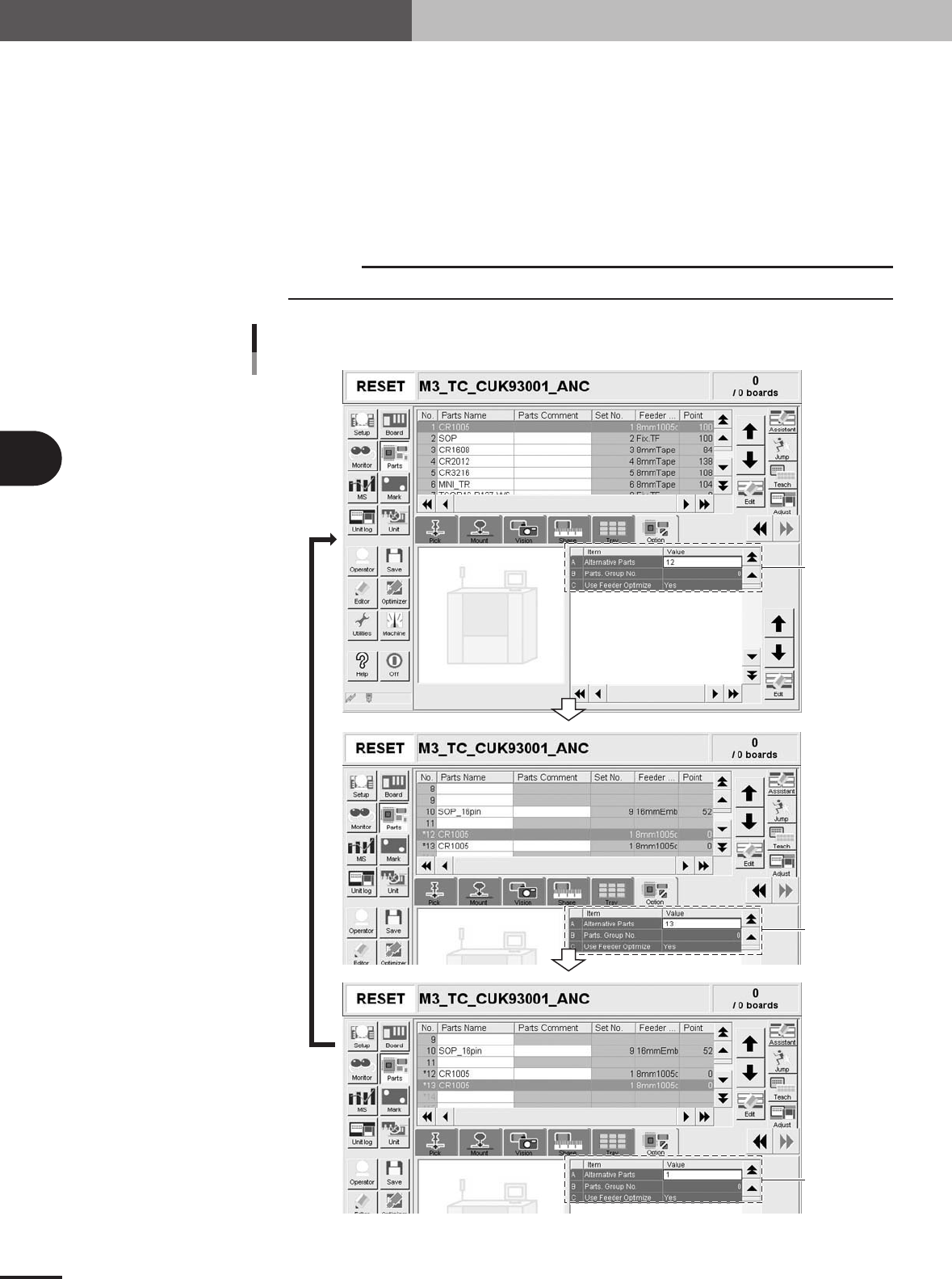 4 - 5 4 Using the adv anced functions 2. Parts parameters 2.1.2 Setting the alternative components The following steps explain how to set the alternative components using tape feeders. 1 Open the [Parts] - [Option] tab s…