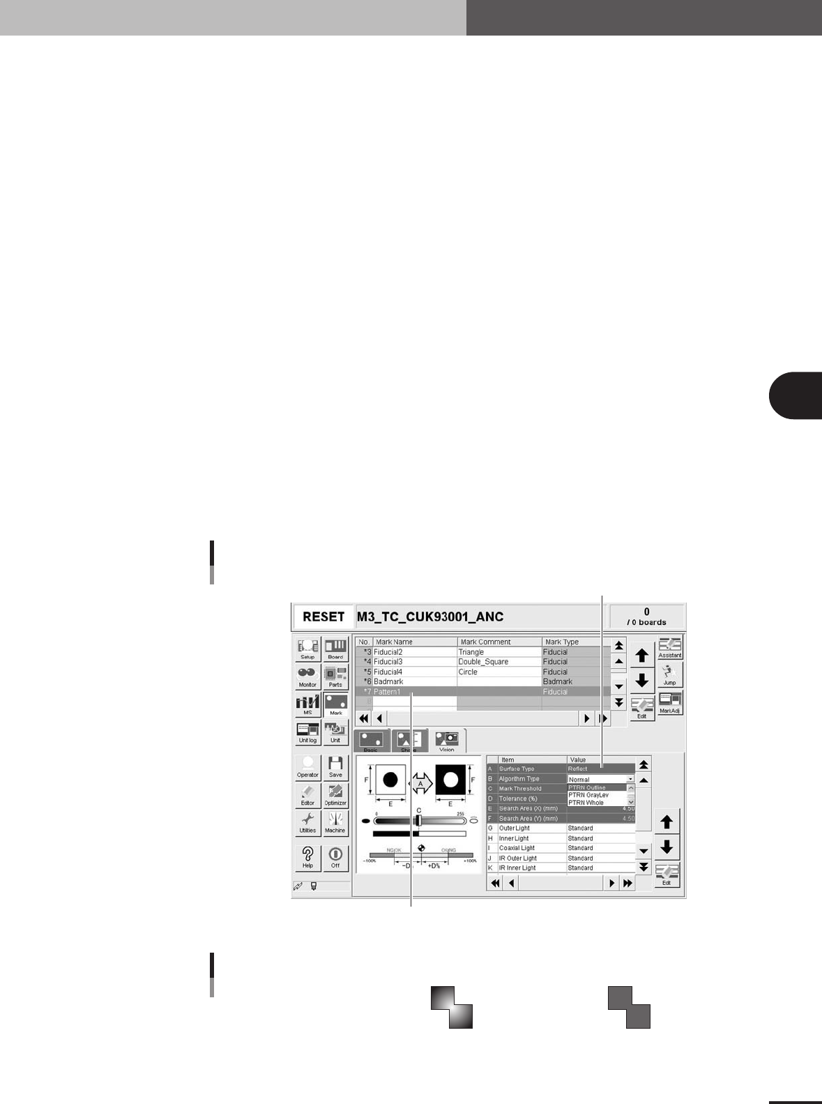 4 - 9 4 Using the adv anced functions 3. Mark parameters 3.1.1 Pattern registration To utilize pattern matching, you must register the reference pattern in the template. 1 Decide on the pattern. Decide which pattern you …