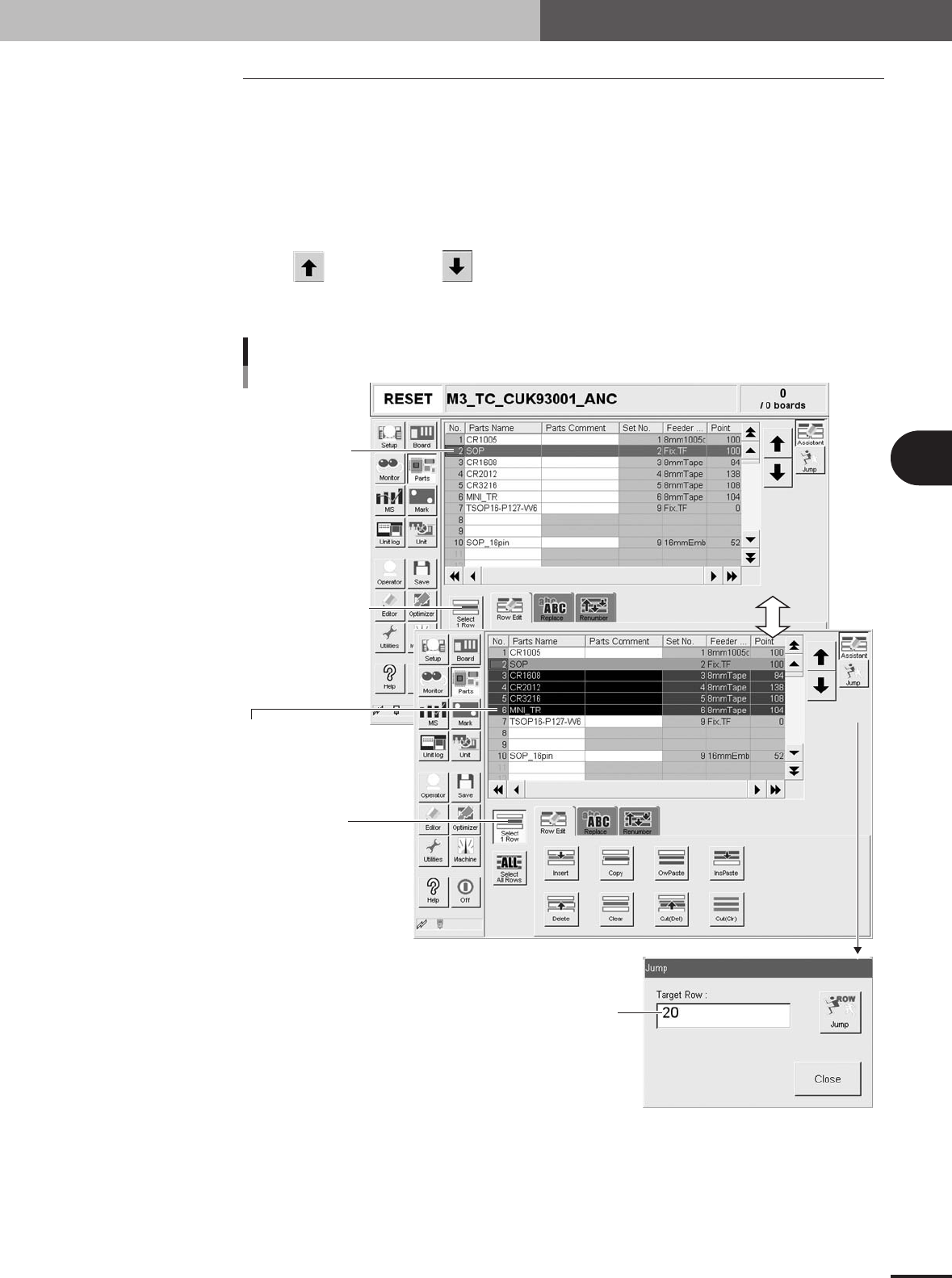 You can also use the [Jump] button to specify the row number in the "Jump" dialog box that