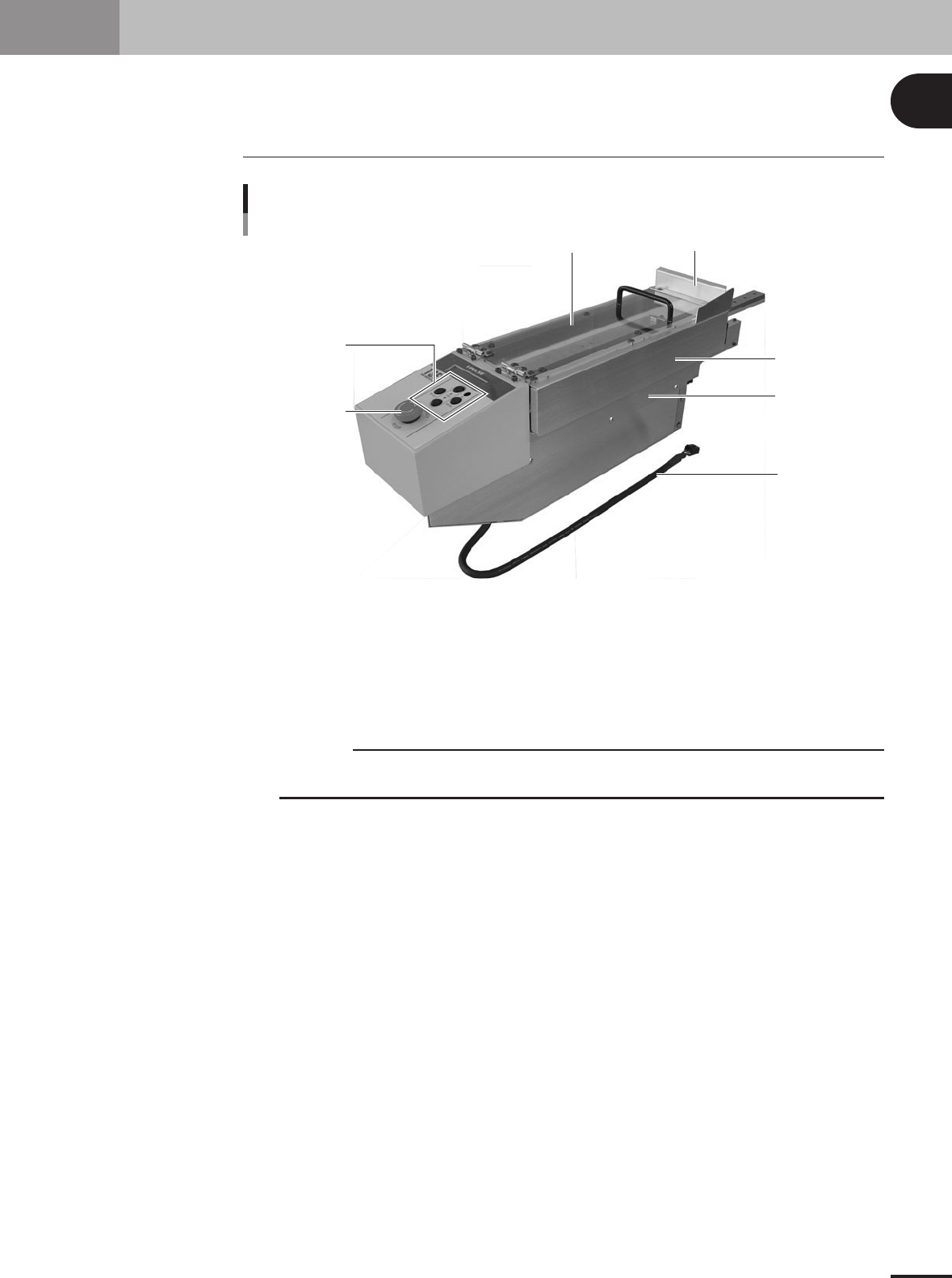 1 P art names and functions 1 - 1 1. Par t names and functions This section describes major part names and functions of the tray shuttle feeder (hereafter called "TSF1"). 1.1 TSF1 main unit Upper safety co ver …