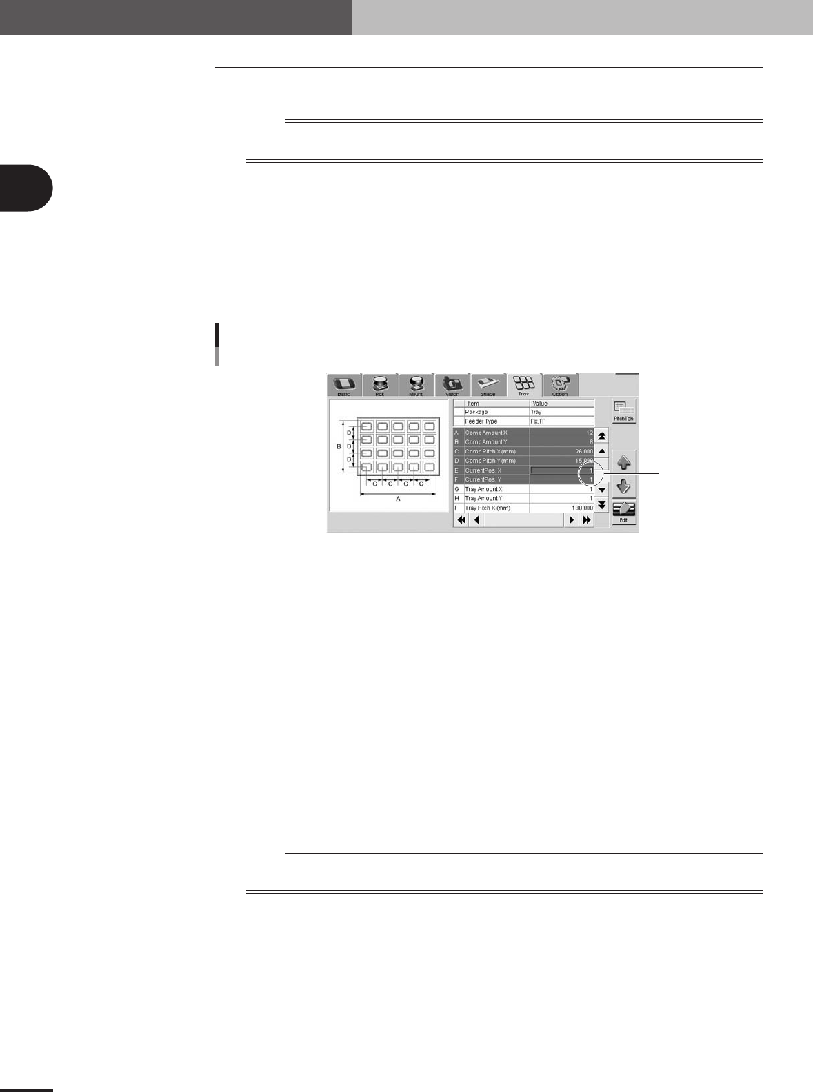 open the [Parts]-[Tray] tab and, in the "Current Pos. X" and "Current Pos. Y" fields,