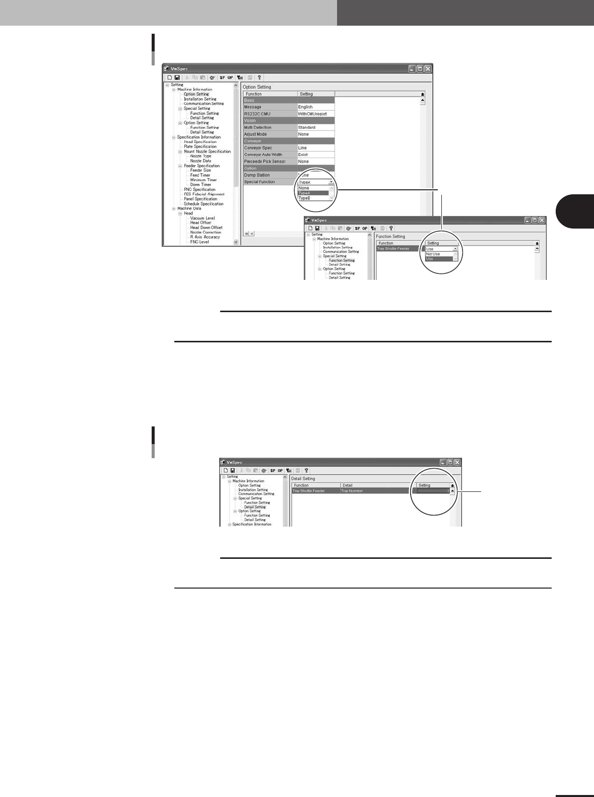 3 - 7 3 Setup Machine setting 1 Set here. 77310-5V-00 c CAUTION If the "Option" - "Special Function" parameter is set to "None" (TSF1 is not used), the "Tray Shuttle Feeder" parame…