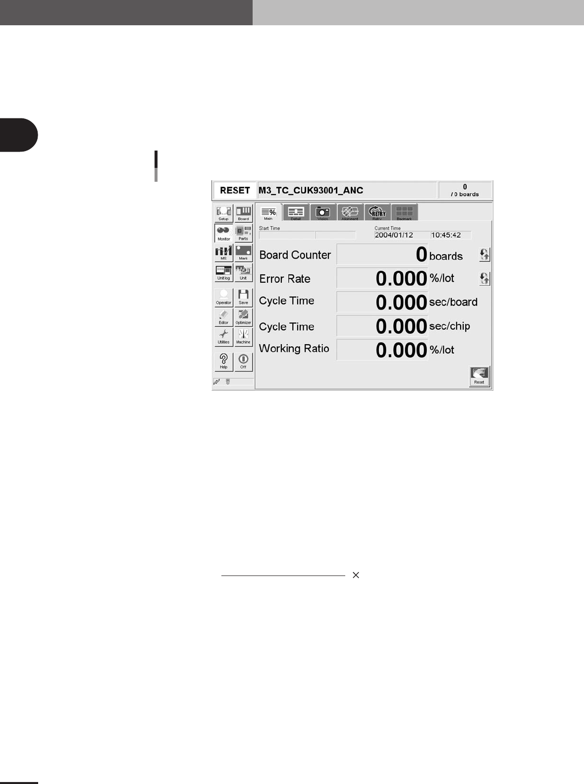 The [Monitor]-[Main] tab screen shows you the real-time production status such as the PCB count