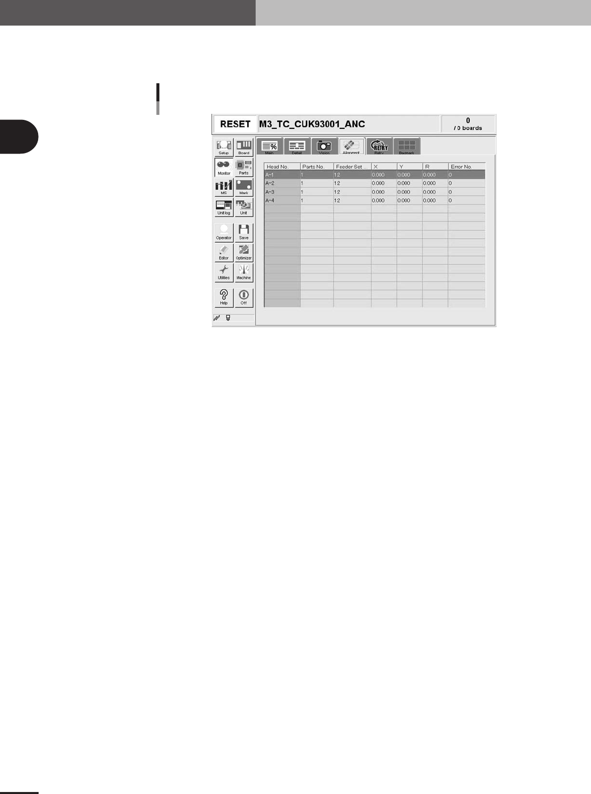 The [Alignment] tab screen shows you the offset amount of each head calculated from the