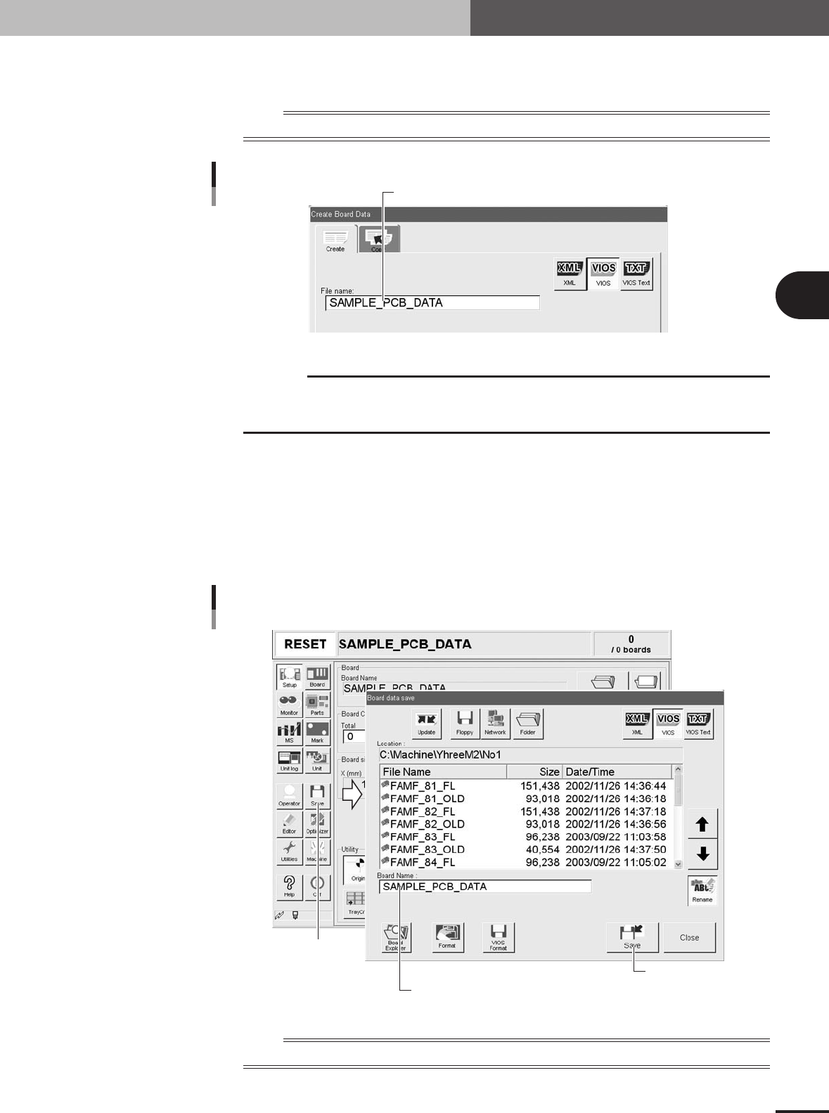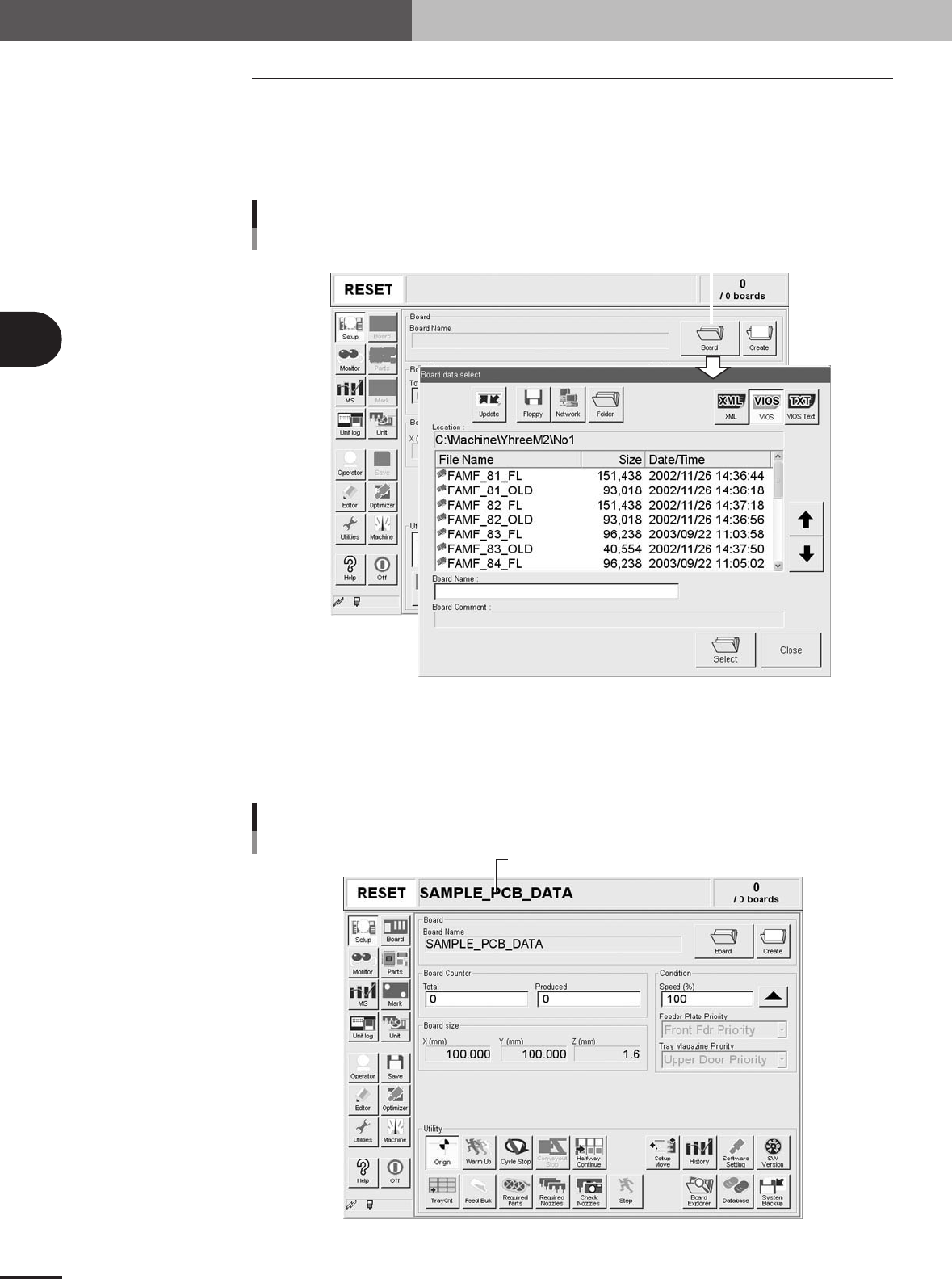 3 - 4 3 Creating the PCB data 2.2 Selecting the PCB data Proceed as follows to select the PCB data you already registered. 1 Press the [Board] button on the Setup screen. The "Board data select" dialog box appe…