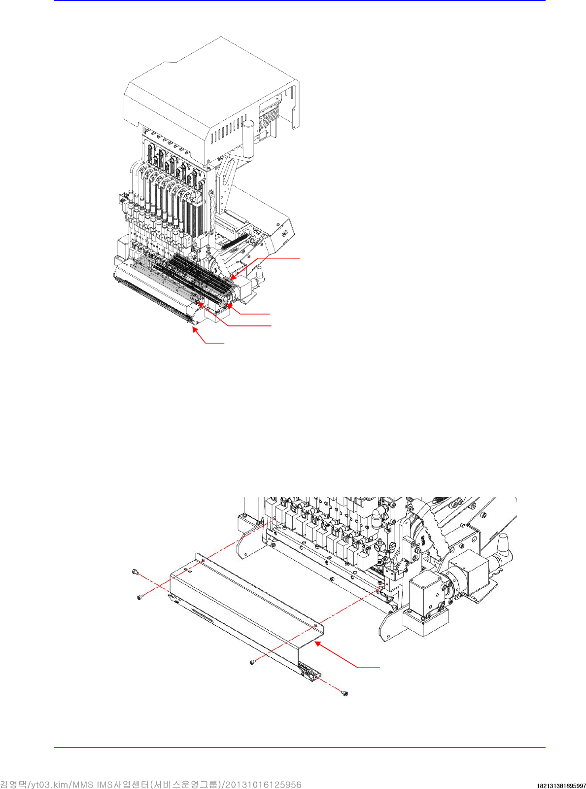 Advance d High Speed Flex i ble Mounter 4-16 5. Un scr ew the fixing b ol ts securing the board using a he x wren c h and remove it. 6. Re plac e the bo ar d wi t h a new one. Referen ce The part number of t h e new boar…