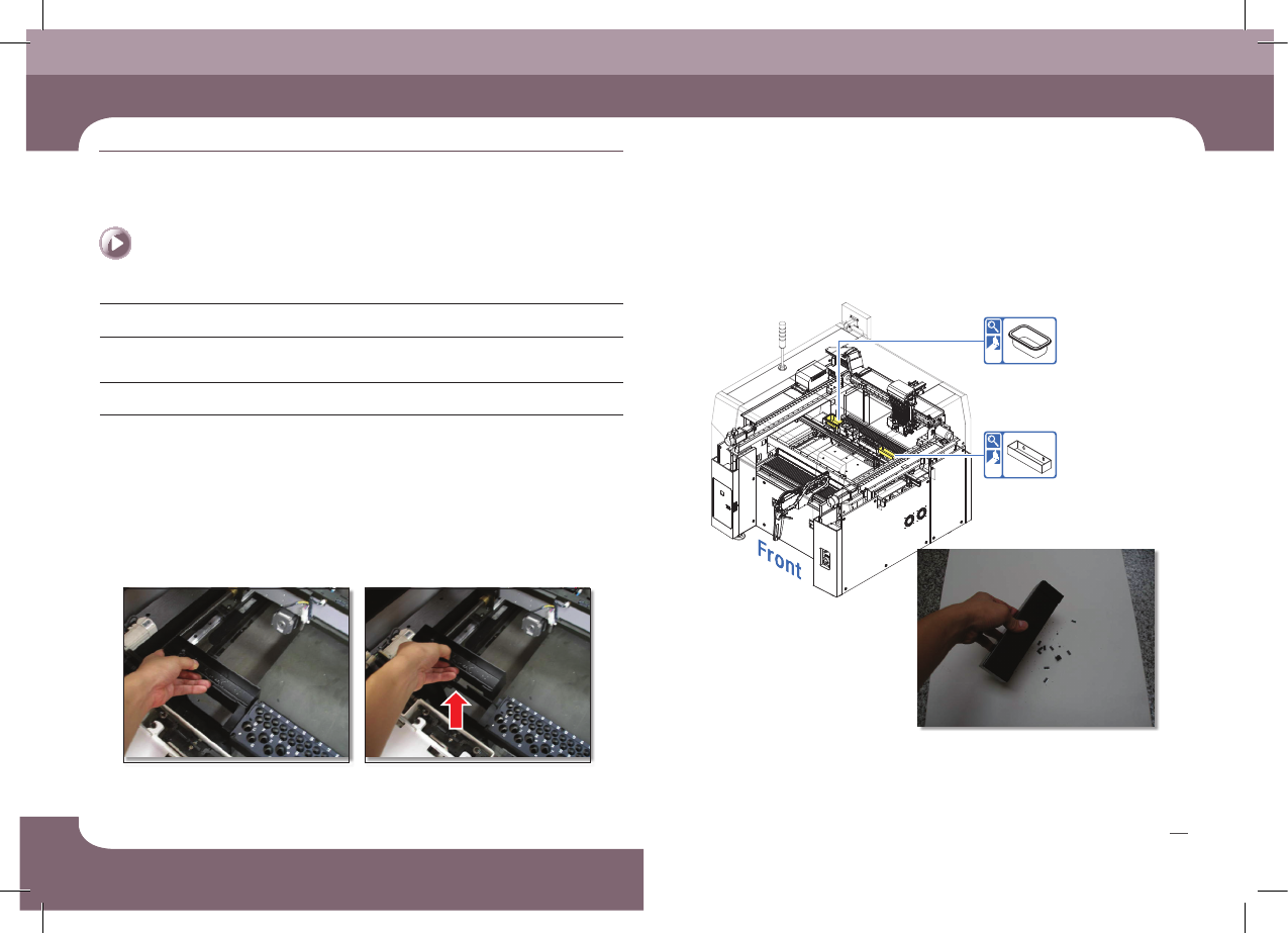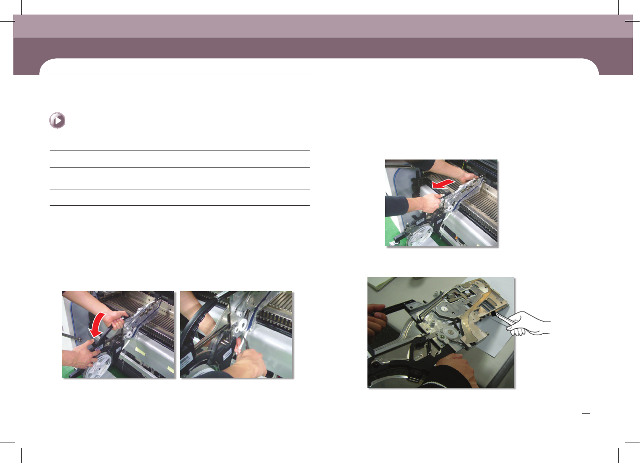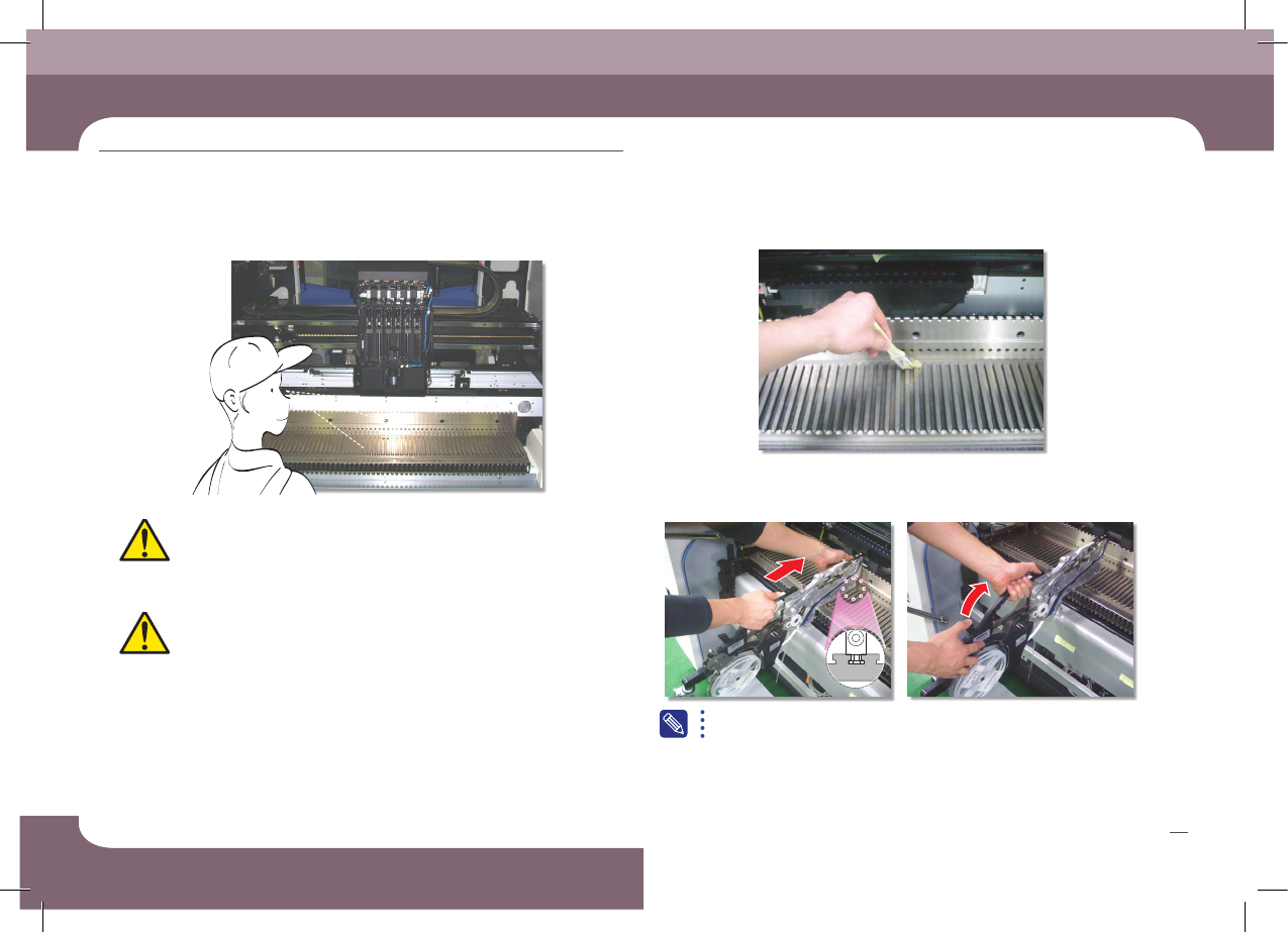 SM421 Maintenance Handb ook 26 Chap ter 3 Adva nced Fl exible Compon ent P lacer 每 日 检 查 ① 后拉 GRIP ② 除去 COVER T APE ③ 卸载供料器 刷子 清扫 Feeder 及 Feeder Base 可以防止 Feeder 安装错误及接口的接触不良。 1. 参考 “X Frame 的背面移动 (10 页 )” 使 X Fr ame 向背…