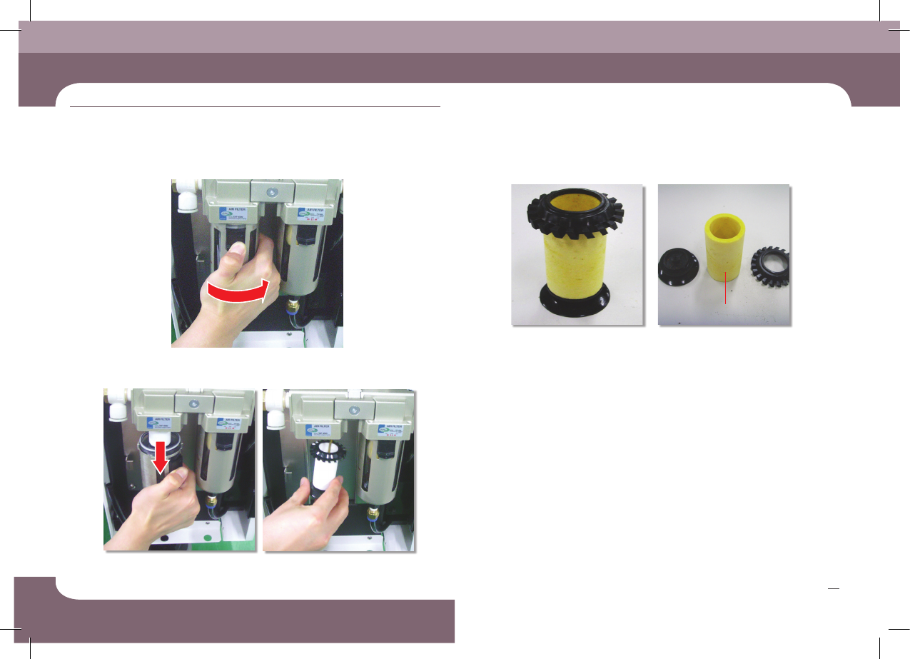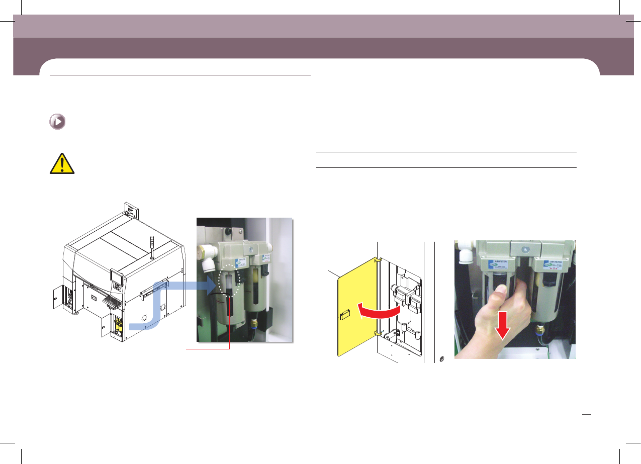 SM421 Maintenance Handb ook 30 Chap ter 3 Adva nced Fl exible Compon ent P lacer Ai r Fi lte r 确认变色 容器闭锁按键 每 日 检 查 清除空气中的灰尘,使用空压时防止因杂物等原因发生故障 1. 按OP面板的 ‘EMG’ 按钮停止作业后,依次按 ’STOP’, ‘RESET’ 按钮。 详细内容请参考 ’ 紧急停止 (8 页 )’ 2. 切断供应…