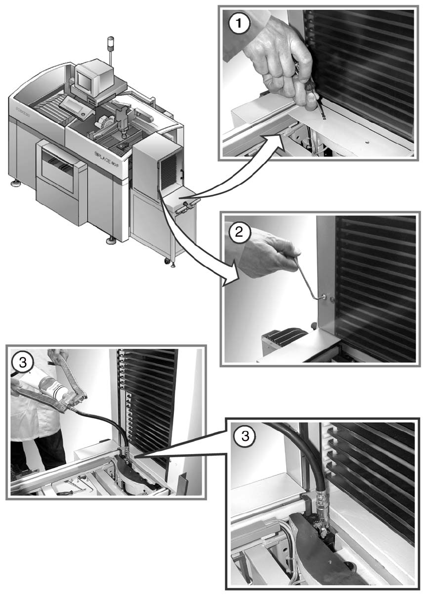 Maintenance Inst ructions F Maintenance 03/2003 US Edition 10 Annual maintenance work 87 a Loosen the 2 screws on the co ver pla te over the c onveyor a rea and r emove th e cover . s Loosen the 4 screws on acryl ic glas…