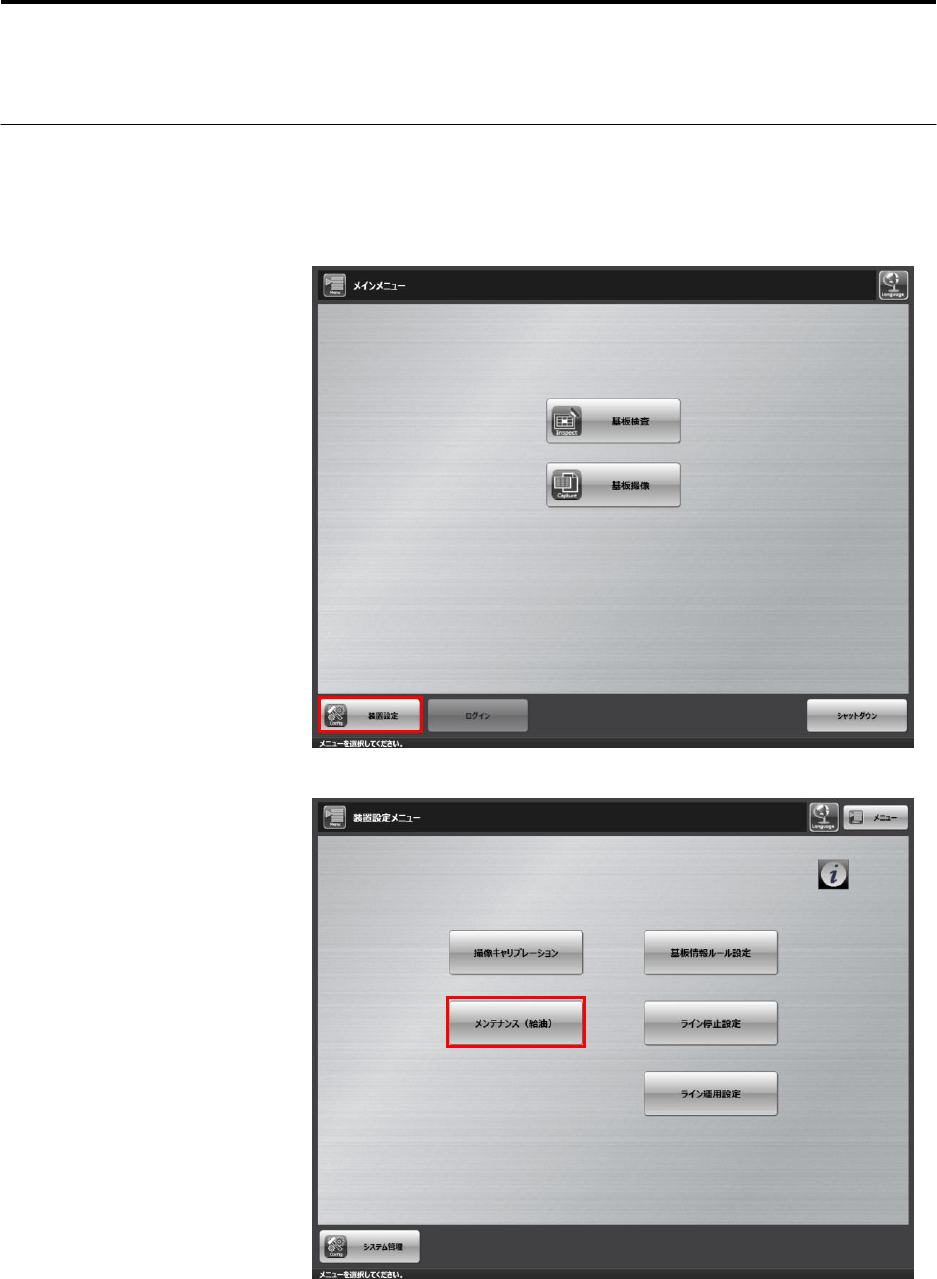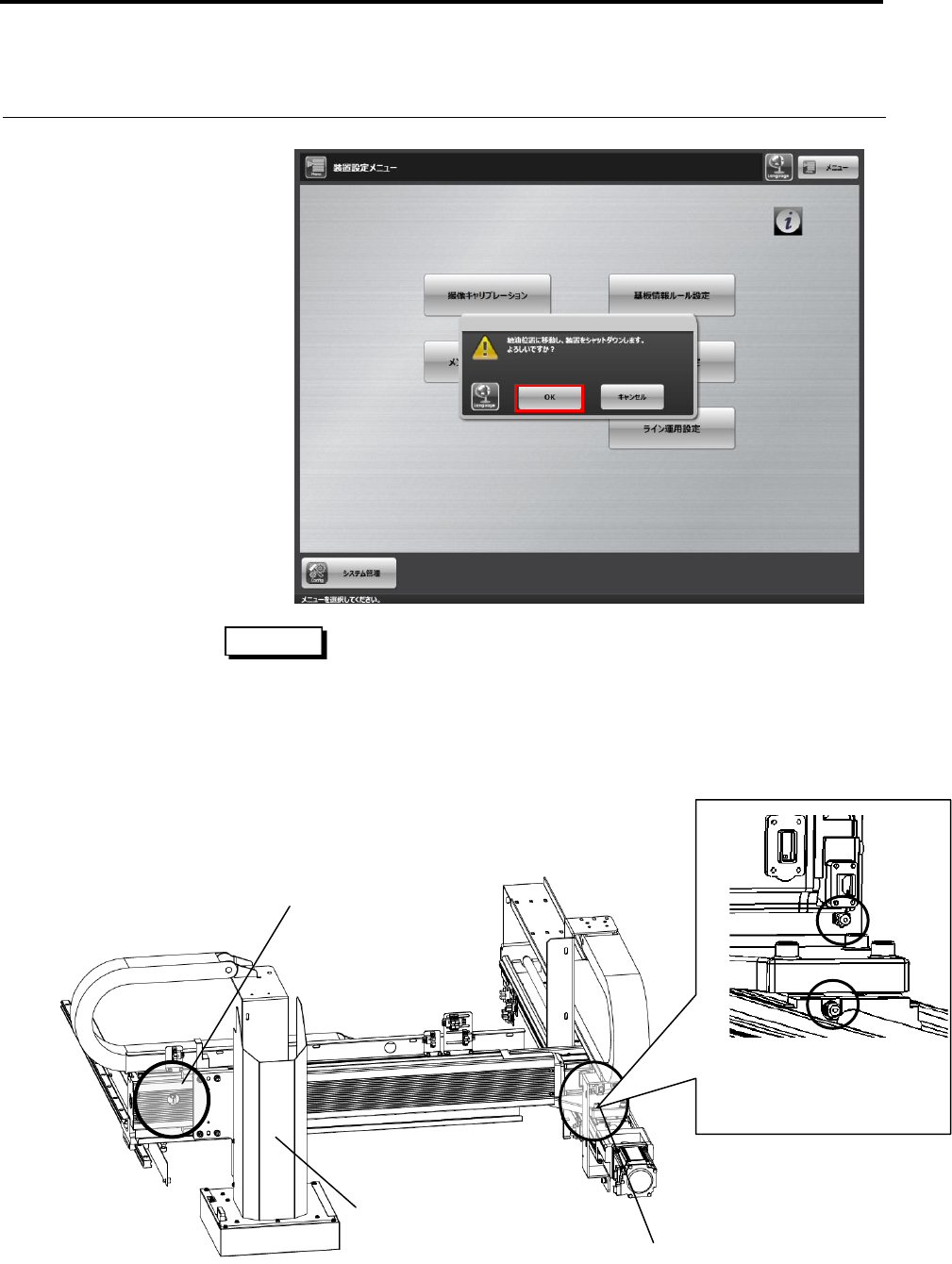 第 6 章 定期 检 修及保 养 6- 12 4. 显示移动至上油位置的 确认对话框时 ,单击 [OK] 。 单击 [OK] 后, 装置 XY 轴即会移动至上油位置, 然后关机。 请等待关机作 业结束。 5. 使用润滑脂加注枪,为 XY 轴的电动执行器上油。 各轴的上油接口位置请 参照下图。 XY 轴上共有 3 个上油接口。 給油ニップルはス ライダと X 軸フレームのモータ下部 付近の 2 箇所にあります。 用于 X 轴 电动执行器上…