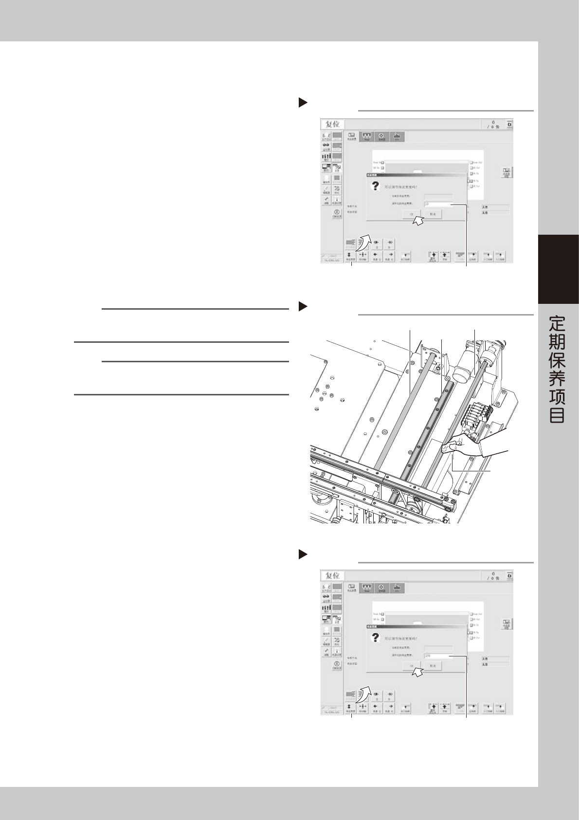 3-48 3 0 将传送宽度调到最小。 1. 关闭贴片机的正面机盖,解除贴片机的紧急停 机状态。使用一次性换料车的机型,需将料车 装回贴片机。 2. 按 [ 装置 ] -“传送装置”画面的 [ 传送宽度 ] 按钮,打开调节传送宽度的对话框。 3. 在“调节后的传送宽度”输入框中输入最小宽 度 (50mm) 并按 [OK] 按钮。传送宽度变为指定 的宽度。 q 使顶板上升。 按照前述 Step3 的方法使顶板上升。 w e 给滚珠丝杆与六…