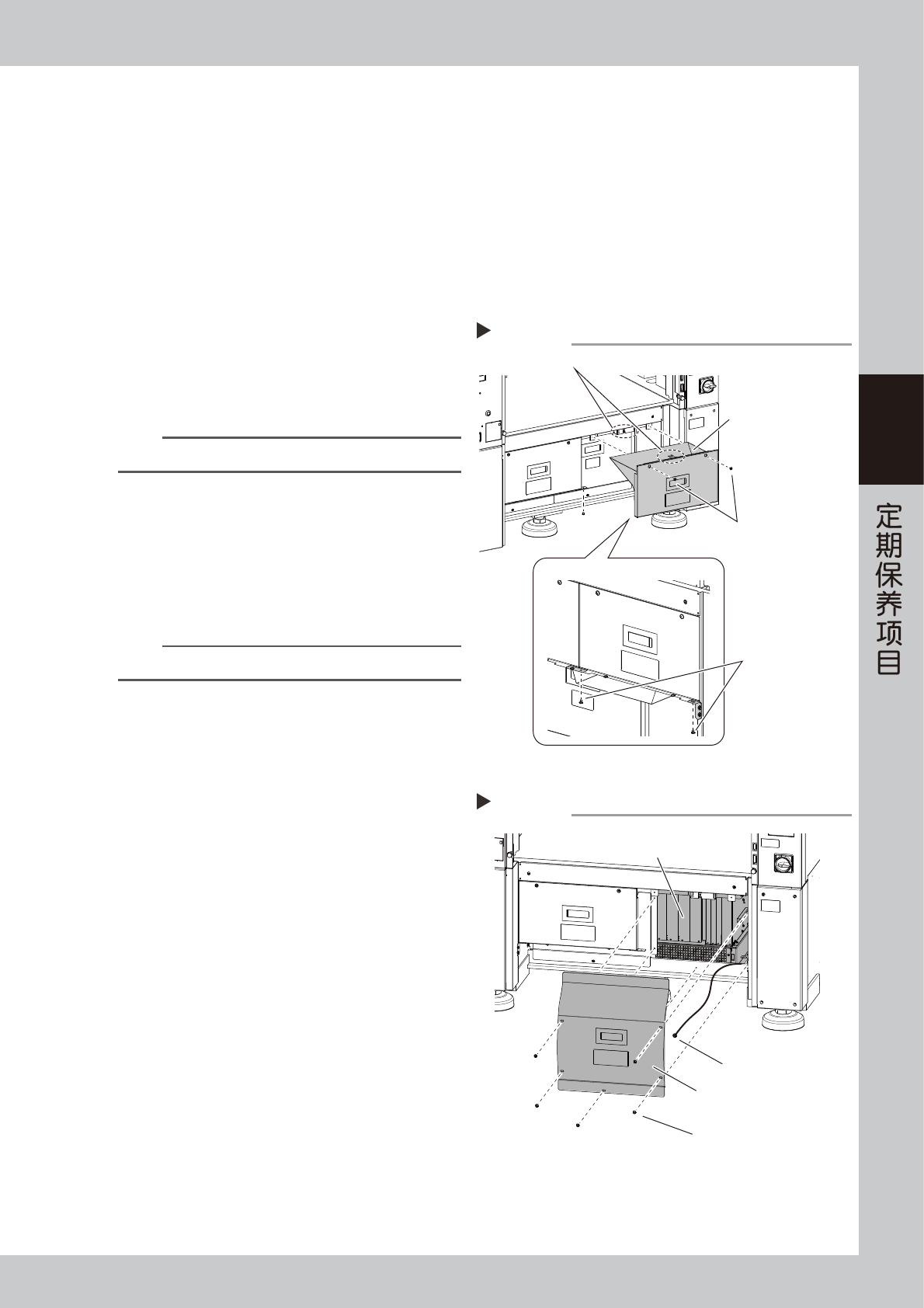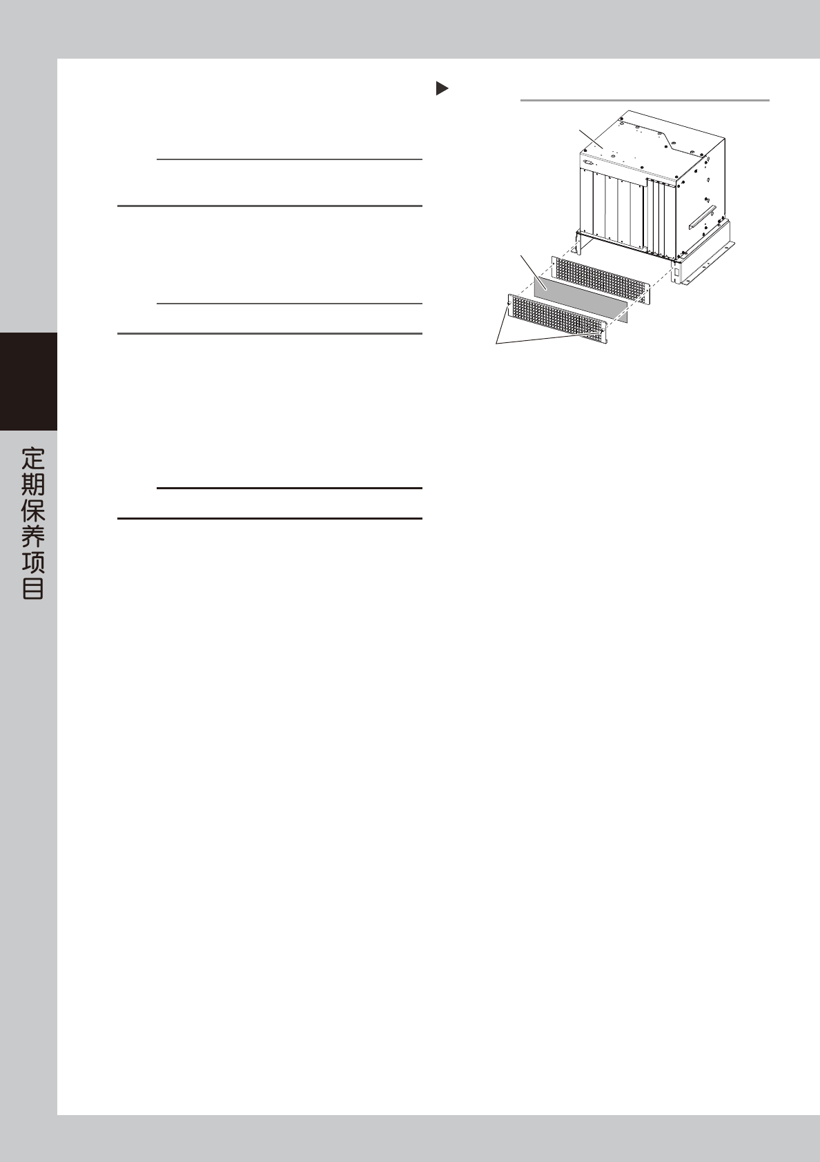 3-58 3 5 拆卸过滤网。 用手旋松过滤网的固定螺丝,将过滤网从控制箱上 取下。 n 要点 控制箱接线较多,若不方便拆卸过滤网,可以根据需要拆卸 接线。 6 清洁过滤网。 过滤网夹在 2 张夹板之间,从夹板中取出之后,用 吸尘器或吸气工具清除过滤网上的脏污。 n 要点 若脏污无法除去或过滤网已老化时,请换上新的过滤网。 7 将过滤网装回原位。 按照与拆卸时相反的步骤将过滤网装回控制箱。 8 将盖板装回原位。 1. 安装内侧的盖板。 …