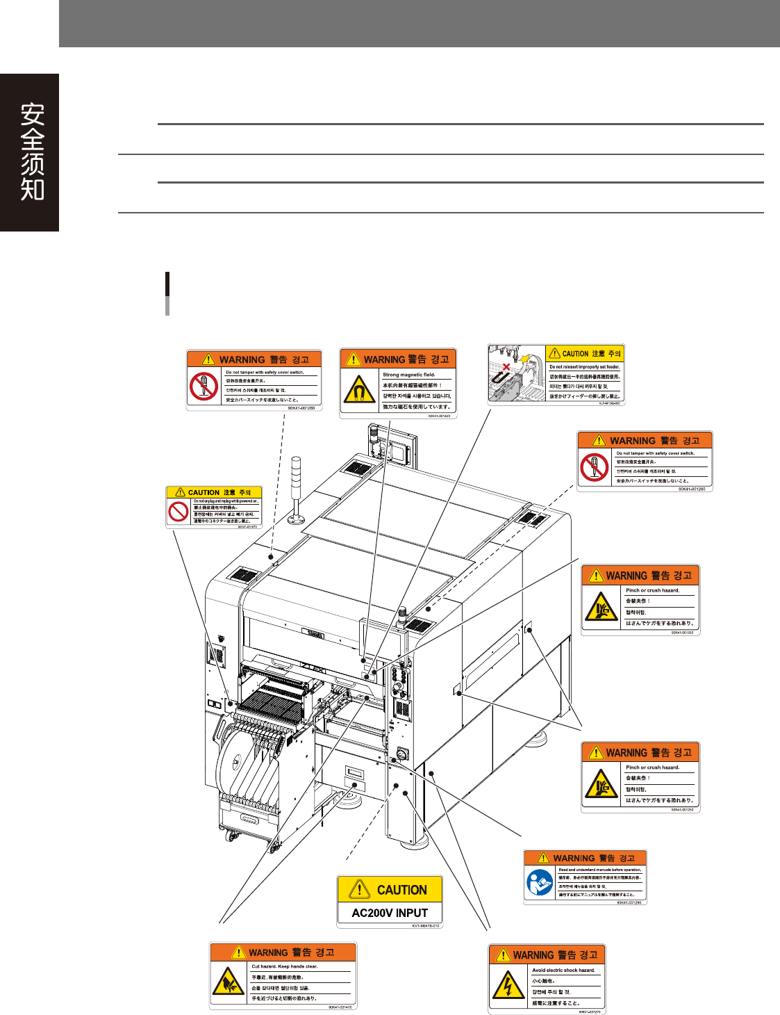 为了安全使用设备,如下图所示,在设备各个部位张贴了警告标贴,务必严格遵守标贴指示。此外,关于本节所