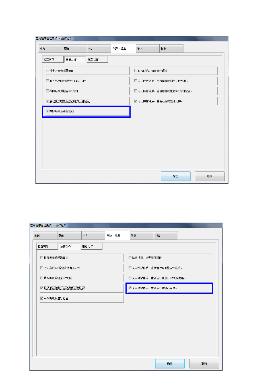 第 2 部 功能详解篇 第 12 章 选项组件 12 - 67 12 -9-2- 2 设置操作选项 (1) 跟踪吸取后进行验证 从菜单栏选择 [ 机器设置 ] — 「 操作选项 」 ,确 认 「跟 踪· 检查」 选项 卡 里的 「跟 踪吸取后进 行验 证」 已经勾选 。 ( 2) 无元件暂停后, 重新运行时验证 元件 与 (1) 同样,确认 「 无元件暂停后,重 新运行时验证元件」已经 勾选。