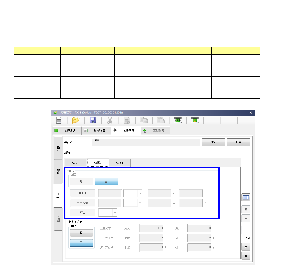 第 2 部 功能详解篇 第 12 章 选项组件 12 - 69 12 -9-2- 3 编辑元件数据 在「 元件数据 」的 “ 检测 ” 中设置是否执行元 件验证以 及检查的判定值 。 二极管等有极性 的元件供给方向设置为 0° 时,设置 方向应为:从机 器的正面 看右侧为 “ + ” , 左侧为 “ - ” 。 详细情况,请参 见「 4-3-5-2-7 检查 2 」 。 输入范围 单位 上限值 下限值 电阻 0.00 ~ 999.99 …