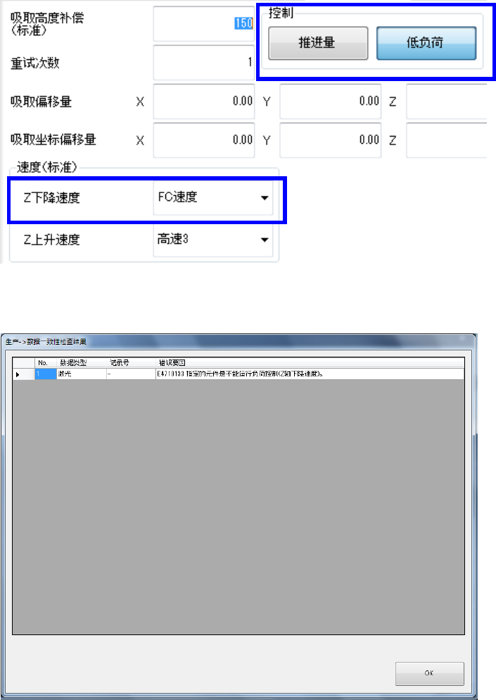 Z 轴下降速度不是 FC 速度,推进量为负荷输入(g)时,一致性检查时会发生错误。