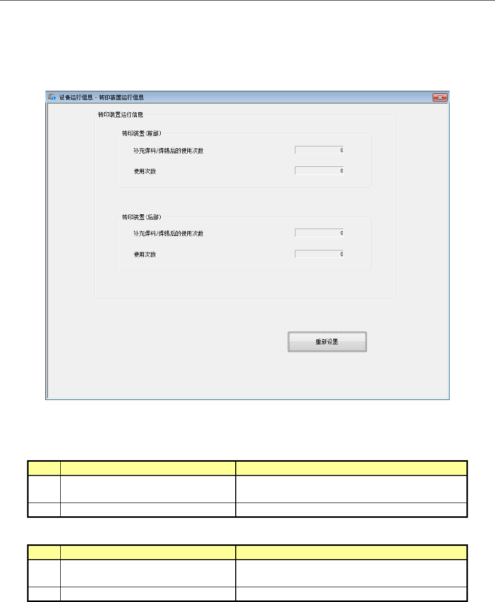 选择画面下部的「重新设置」按钮,可清除转印装置运行信息。使用剩余量警告次数时,