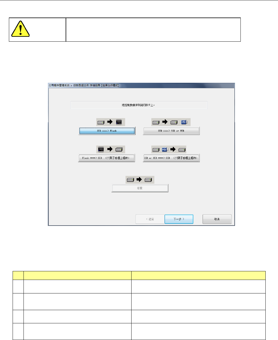 第 2 部 功能详解篇 第 13 章 程序补充 13 - 10 13 -2- 1 将控制数据保存到闪存的处理 选择 1. [ SSD ===> Fl ash ] (把控 制数据保存到 主机闪存上) 后,显示 如下的画面。 确认要保存的内 容后,请按 [ 下一步 >] 按 钮。 如果要变更操作 内容等,请按 [< 返回 ] 按钮。要结束 作业时请按 [ 取消 ] 按钮。 按 [ 运行 ] 按钮来保存控制数据 。