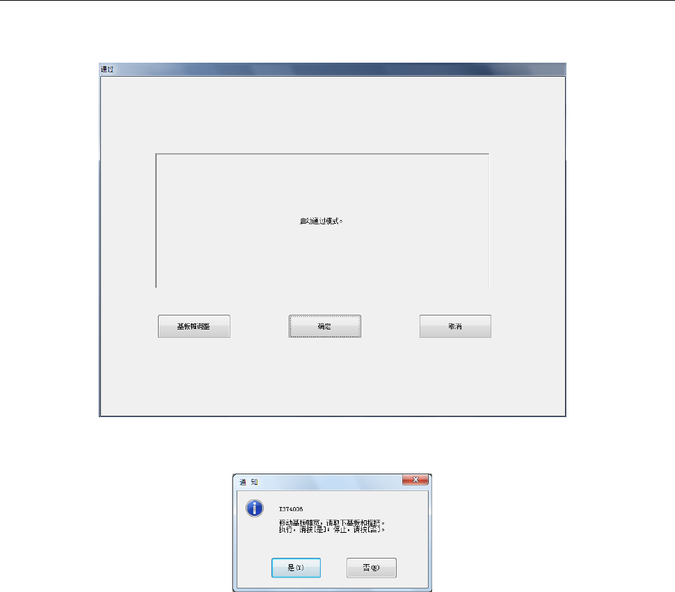 第 1 部 基本篇 第 2 章 生产 2- 17 2- 5 通过模式 不实施生产,只 作为传送缓冲,让基板传 送通过 时使用 。 在主画面菜单中 选择 [ 生产 ]-[ 通过 ] ,会显 示以下画面, 返回原点完成后 ,即进行全轴退 避。 全轴退避后,显 示「询问调整基板宽度提 示信息」画面。