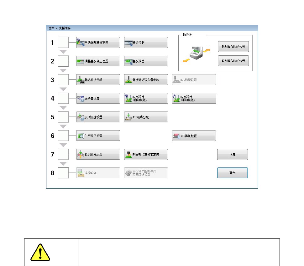 第 1 部 基本篇 第 2 章 生产 2- 30 2-7-1- 2 传送轨道宽度的调整 <在「自动调整 基板宽度画面」中的 调整方法> (1) 请从 生产的菜单 选择[生产辅助 ]-[支援准 备] 。 (2 ) 请对准传送宽 度尺寸。 按下画面的 1 「自动调整基板宽 度」 ,即可 显示 「自动调整 基板宽度 」 画面。 「自动基板宽度 调整」在单通道、双通道 下,有不同的操作。 注意 按照 以下说明点击 [ 移动 ] 按钮 后,传送即…