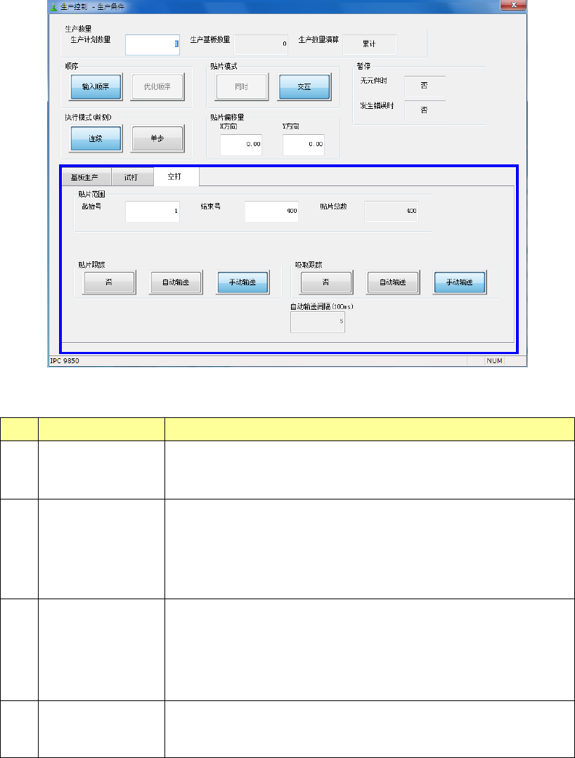 第 1 部 基本篇 第 2 章 生产 2- 42 (3) 空打 No. 项目 内容 1 贴片范围 需限定贴片范围 时,请输入开始步骤号和 结束步骤号。 在总贴片 点数项中显示每 1 个 电路中的总贴片步 骤号。 仅在设定为输入 顺序时才能指定此项。 2 贴片跟踪 设置在空打基板 后,是否用摄像机进行贴 片点跟踪, 以及跟踪时是自 动输送还是手动输送。 · 否 :不跟踪。 · 自动输送: 自动跟踪贴片 点。 · 手动输送: 在贴片点停下 …