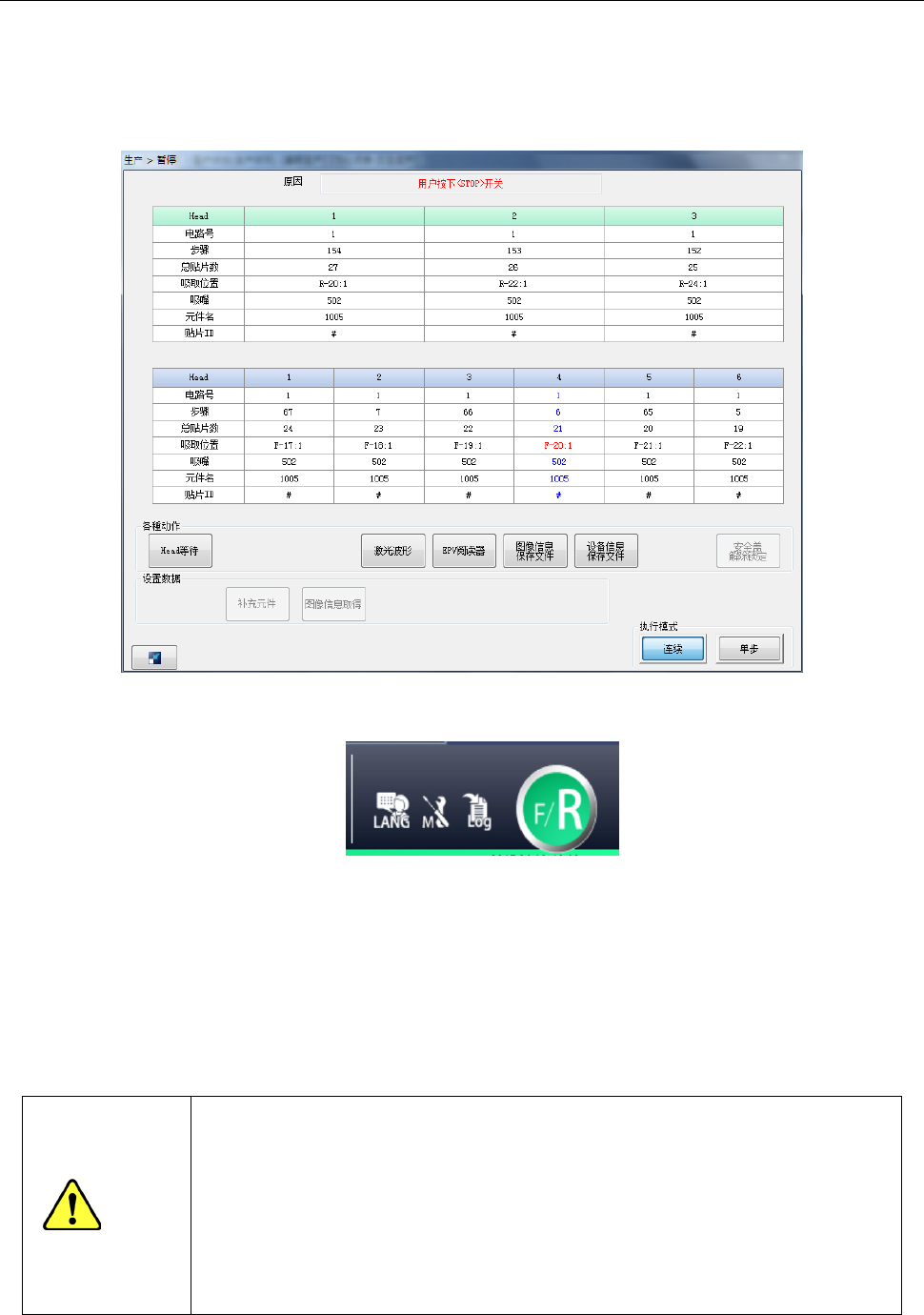 第 1 部 基本篇 第 2 章 生产 2- 55 (1) 在生产条件 的 执行 模式项目中勾选 「 单步」 时,按下操作面板的 <ST ART> 开关开始生产运 行 ,也会变为生产状态 画面。 在此基础上,与 暂停画面一样,将显示单 步生产 画面 。 (2) 在连续生产中 暂停时, 按下画面上的 [ Head 等待 ] 按钮 ,可将 H ead 移 动到退避位置。 (3) 在单步生产中 停止, 或在连续生产中暂停时 , 按下…