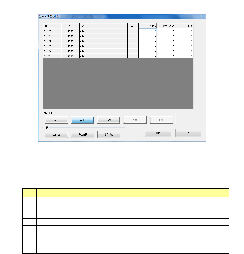 第 1 部 基本篇 第 2 章 生产 2- 71 2) 设置项目 NO. 项目 内容 1 初始值 设置使用 前的包装供应 的元件数量。输入 初始值或变更后 的数值, 即被复制为剩余 数量。 输入初始值后, 该值同时成为剩余数的设 置值。 · 供料器元件设置 为 「 0 」 时,不进行剩余数递 减管理,而会继 续进 行贴片,直到重试超次为止。设置「 0 」以外 的数值后,按下 [ 补满 ] 按钮 ,该数值即为 剩余值。 2 剩余 元件数 …