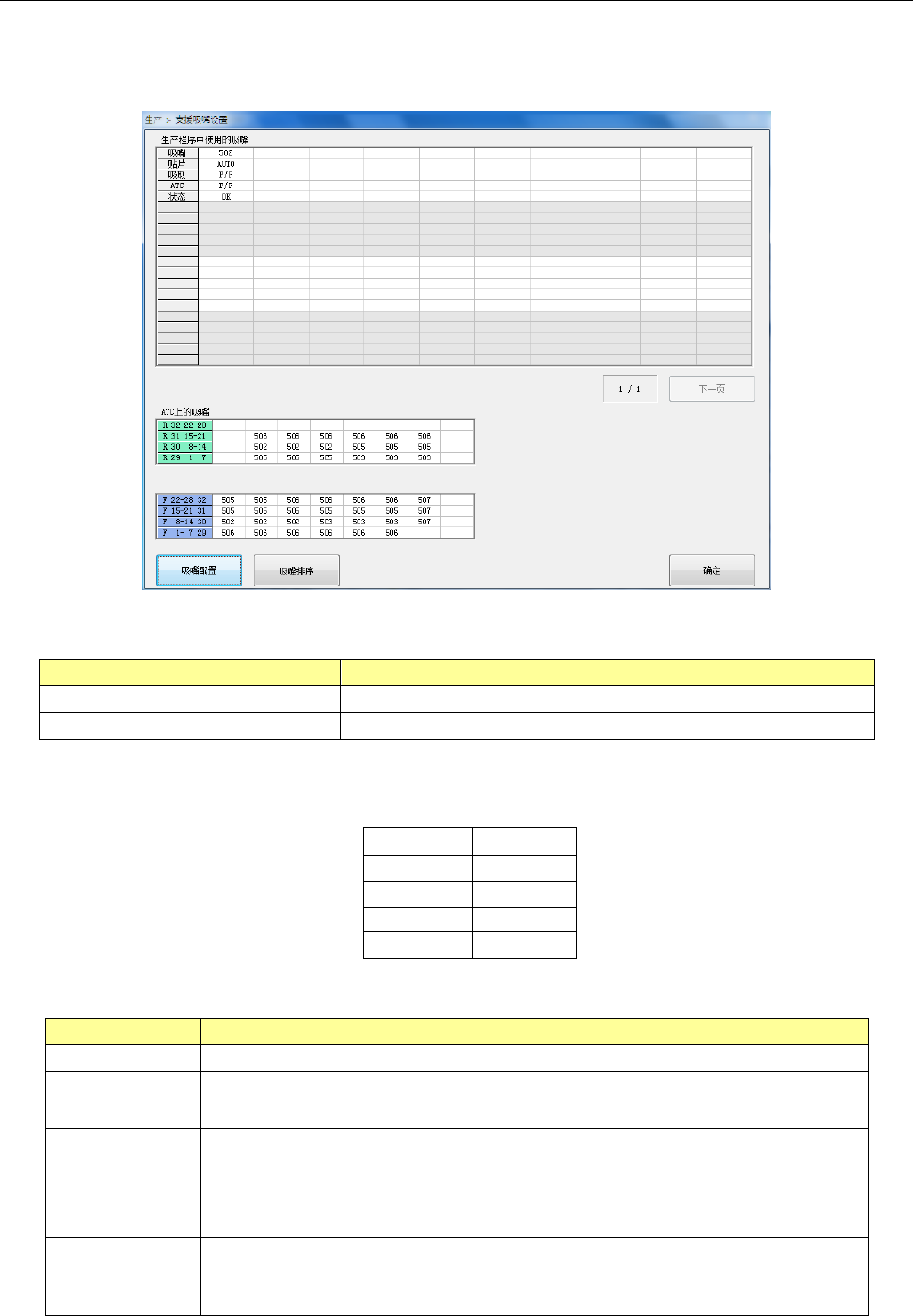 显示生产程序中使用的吸嘴的表的内容,吸嘴号码、贴片 Head 单元、吸取的台架、可使用吸嘴 ATC