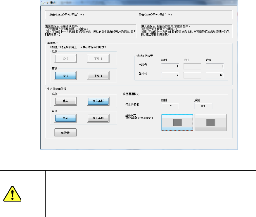 第 1 部 基本篇 第 2 章 生产 2- 144 ○ 双通道生产时 双通道生产时, 对于继续生产、生产开始 前处理的选择,前后通道 要分别设定。 基板状态也会前 后通道分别显示。 注意 1. 「 不搬出基板继续生产 」的「 重夹 」 基板生产,是在生产再开始前 已经读 入生产文件,关闭 生产画面的情况下进行的 ,因为对生产中断时传送 通道 状态不明,因而 可能出现缺件或误贴片。 2. 执行「 不搬出基板继 续生产 」 时,若基板尺寸 …