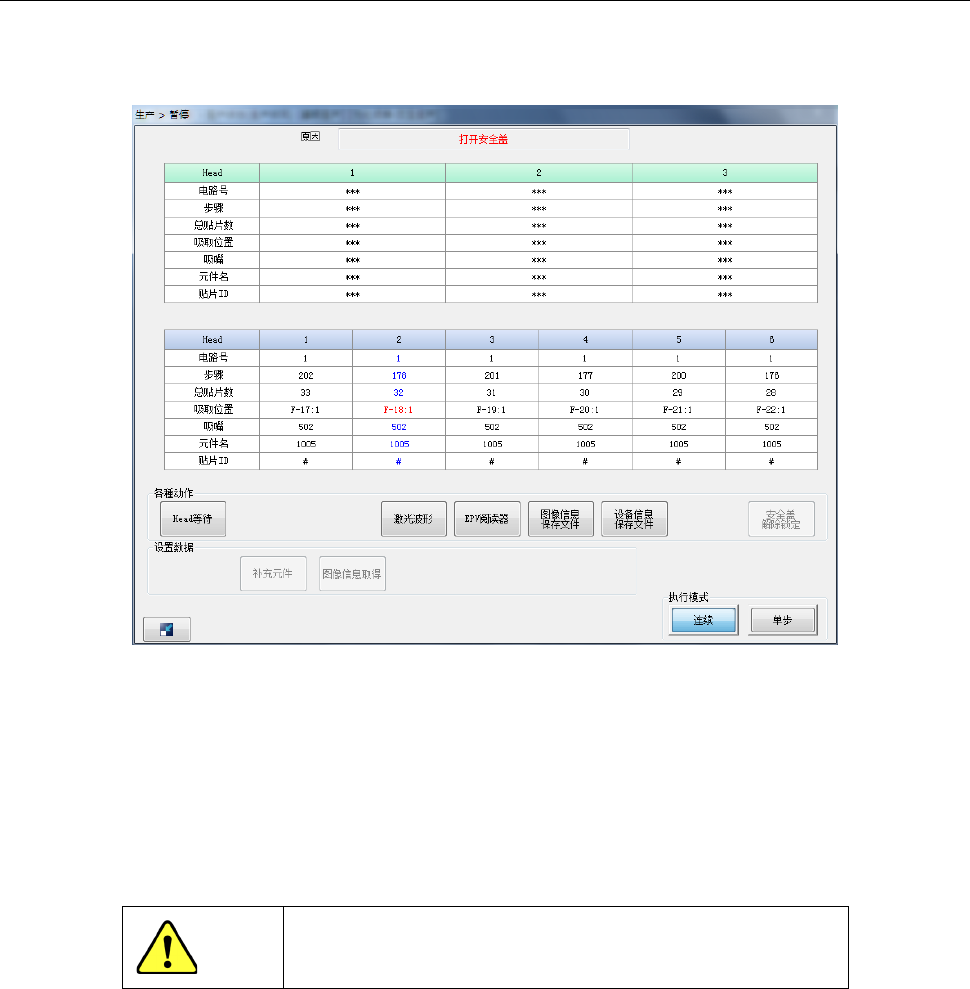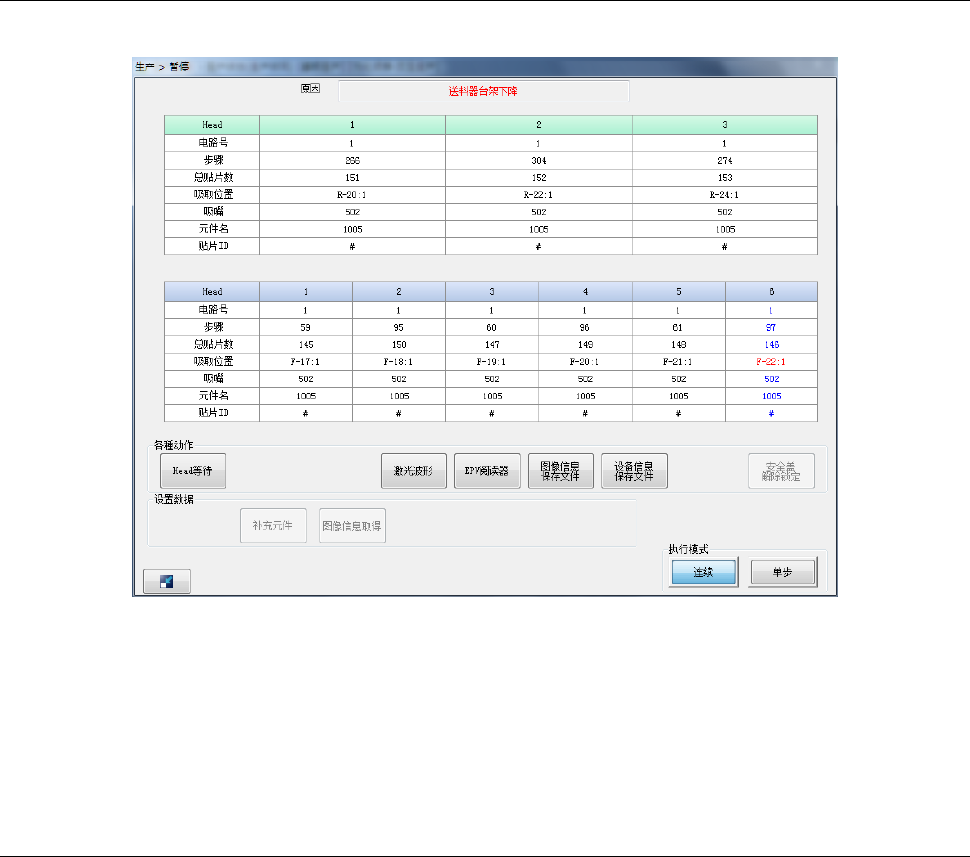 生产中送料器台架下降时,会暂停生产,显示暂停画面。