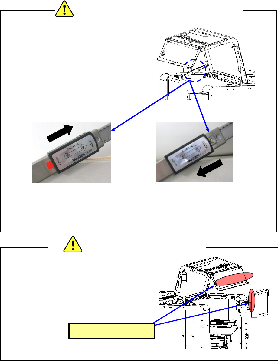 第 1 部 基本篇 第 1 章 装置概要 1- 12 ◆ 打开 安 全盖(安全罩) 时,先把 盖(罩) 子推上去 , 再把锁杆向箭头 ( LOC K )方 向推, 锁好 。 确认上了锁之 后, 再放开手。 ﹡没有上好 锁就松手时, 安全盖(安 全罩)有落下 来的危险。 ◆ 要关 安全 盖(安全罩) 时,要先解开锁,再 关闭。 把安全盖(安全 罩)向上提, 再把锁杆向 OPEN 方向推,解锁。 (请注意,解 锁时要防止安全盖(安全 罩)落…