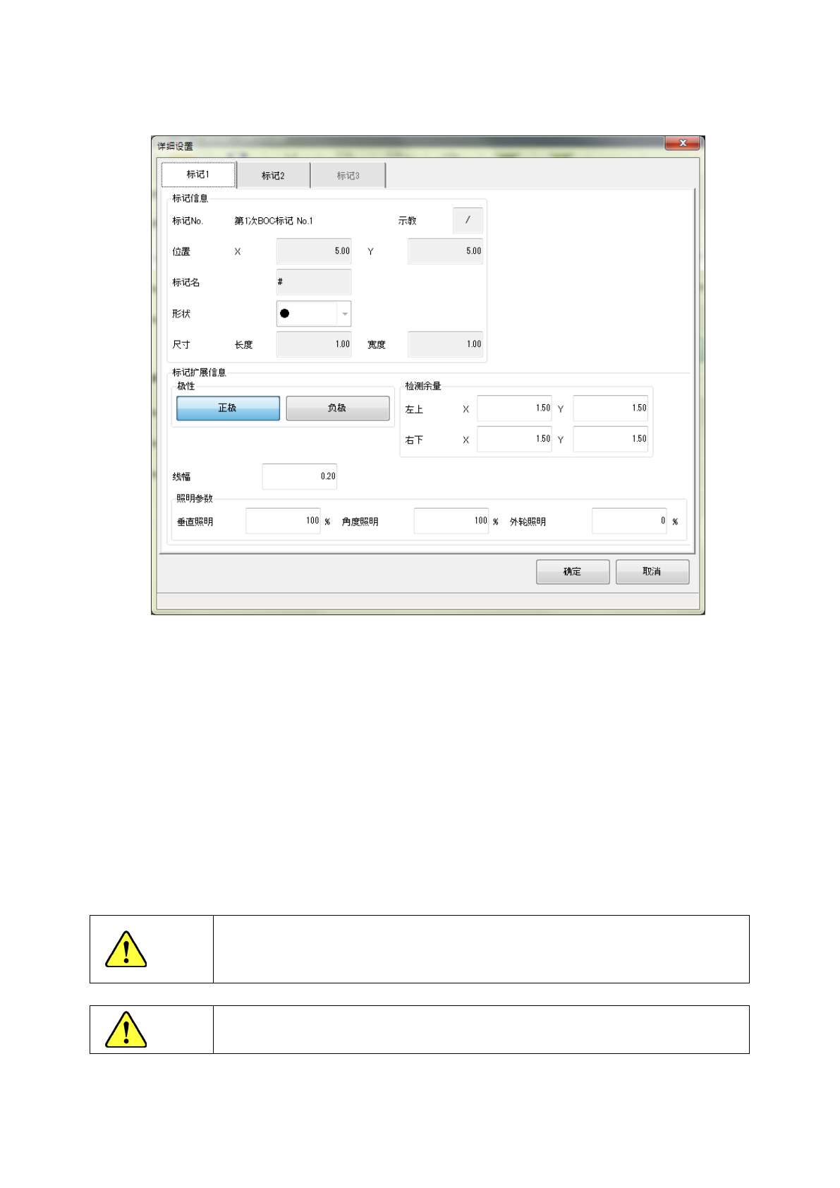 第 1 部 基本篇 第 4 章 制作生产程序 4- 26 按下详细设置按 钮,即显示如下 画面。 可使用标记的 No.1 ~ 3 选项卡进行 切换 。 (1) 标记信息 显示 B OC 标记画面 中设置的信息。 (2) 极性 设置是否反转拍 摄图像的明暗。 (3) 线幅 输入标记的线宽 。但对于无需线宽的形状 ,则不使 用该数值。 (4) 检测余量 以距离标记外形 的距离输入识别标记时检 测框的尺寸。 (5) 照明参数 输入拍摄标记时 …