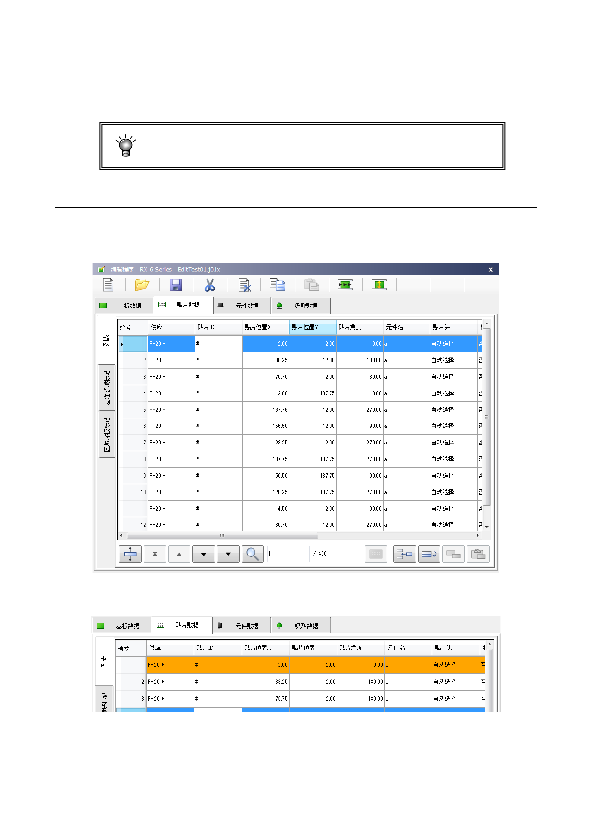 第 1 部 基本篇 第 4 章 制作生产程序 4- 37 4-3- 4 贴片数据 输入与贴片元件 的贴片坐标有关的信息。 多电路板时,输 入相对于 “ 基准电路 ” 的信息。 贴片点数 :与单板基板 、多电路板无关, 总点数最多可输 入 10 , 000 点。 4-3-4- 1 显示贴片数据画面 制作基板数据后 , 选择画面 上方的 「贴片数据」 选项卡, 可显示贴片数 据制作画面 ( 下图为制 作完 成的示例 ) 。 设置为跳过 ( …