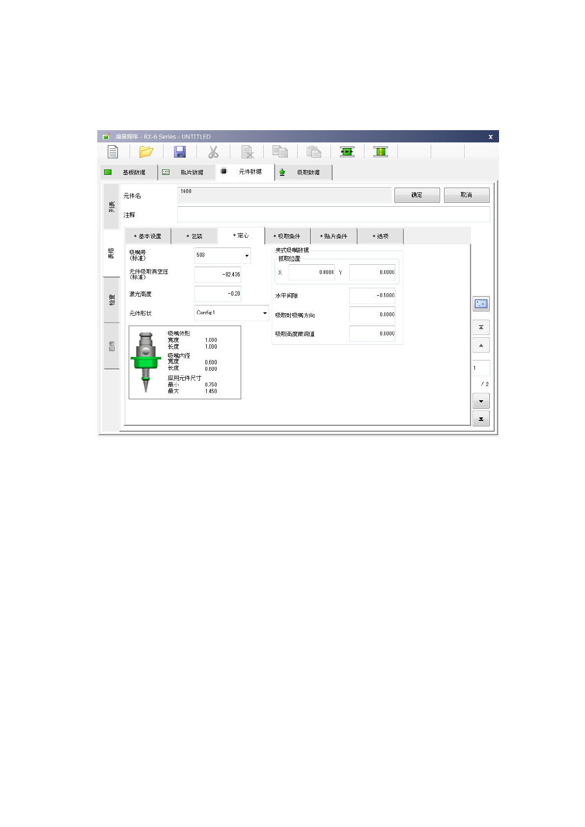 设置“吸嘴号”、“元件吸取真空压”、“激光高度”、“元件形状”、“夹式吸嘴数据”。