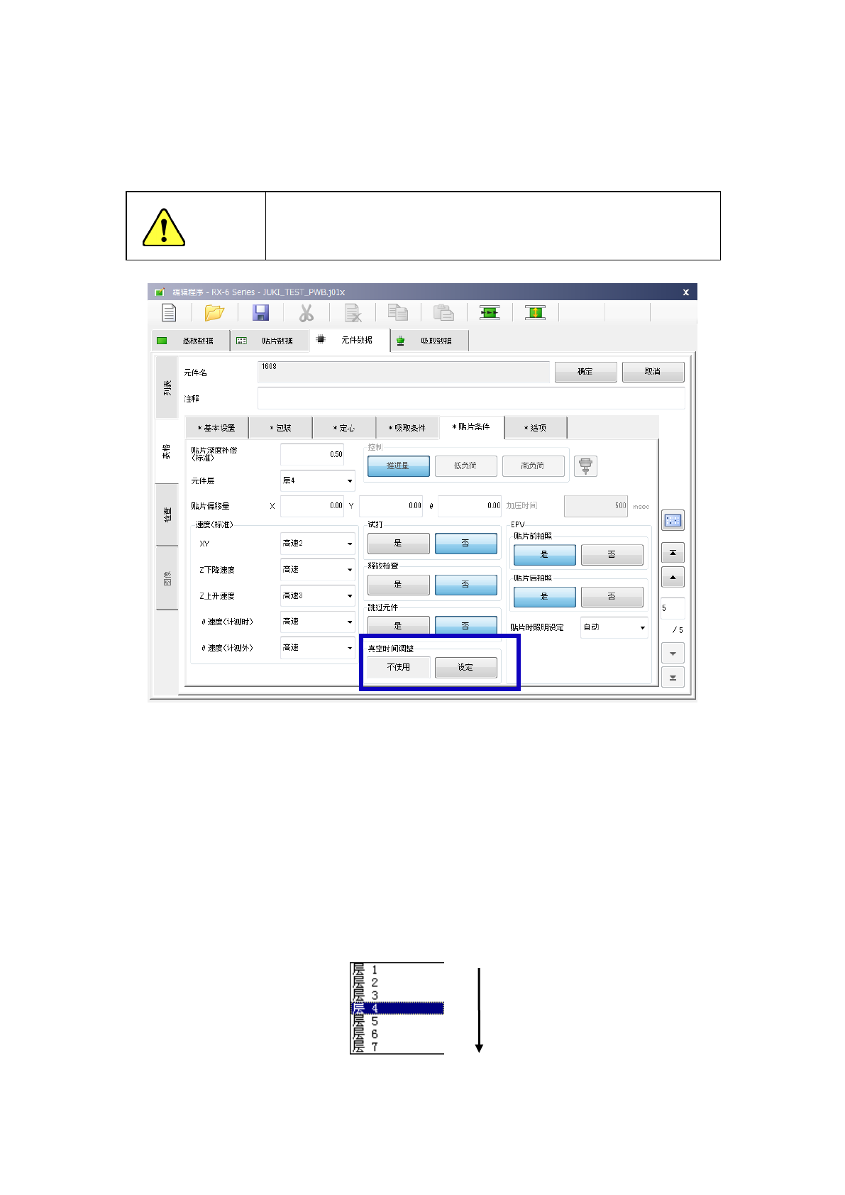 设定「贴片层」,可设定当贴片优先顺序前位的元件用完时「无元件」暂停,但「元件层」的设